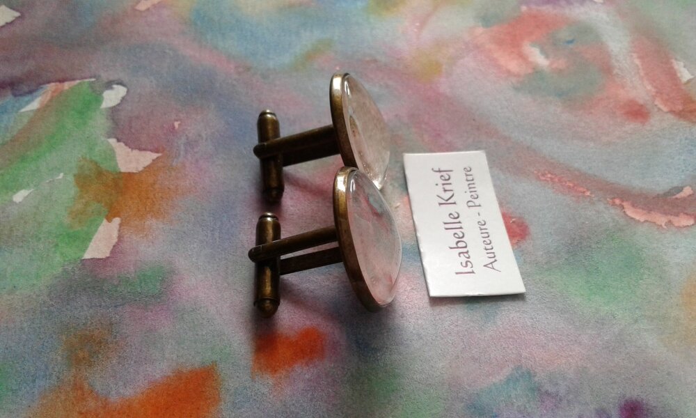 aquarelle originale ooak,artiste peintre française,boutons de manchette,ronds 25mm,rouge marron vert bleu,laiton bronze,bobo boho gothique