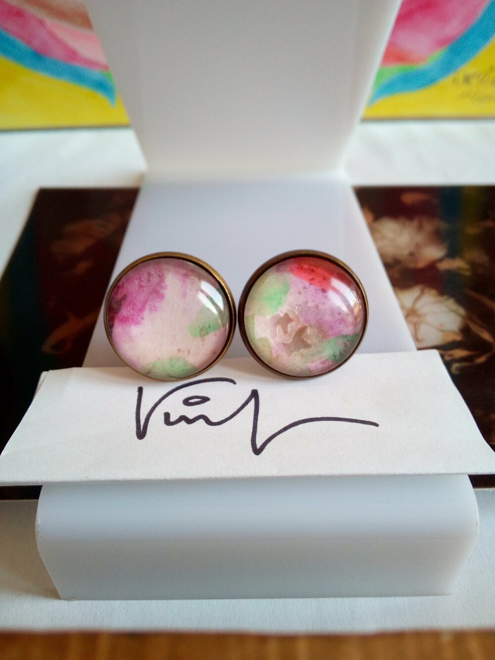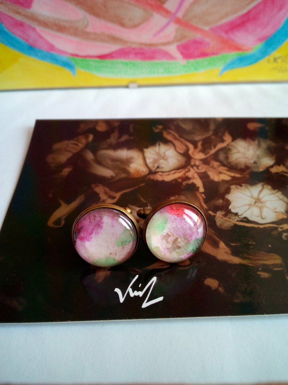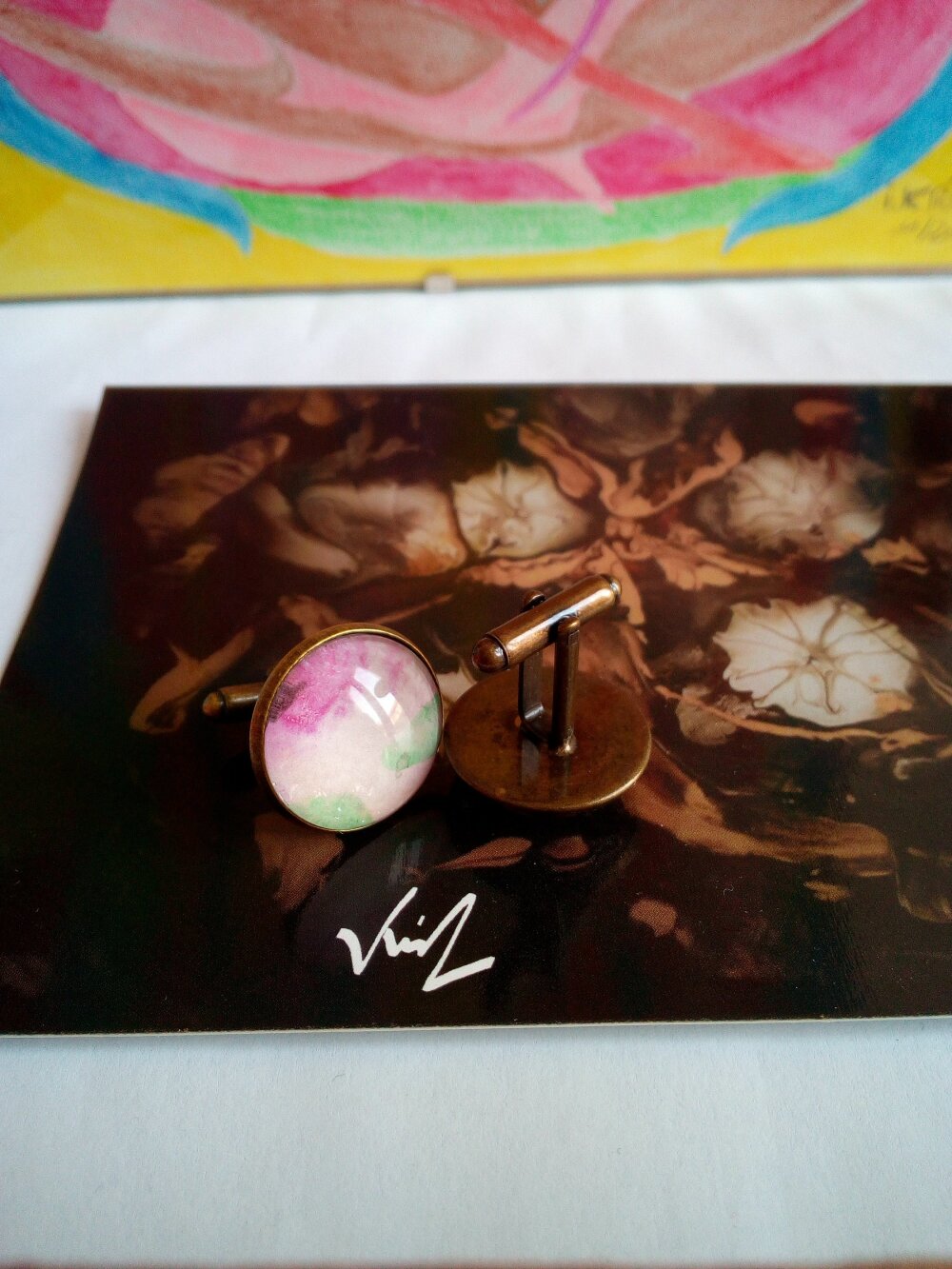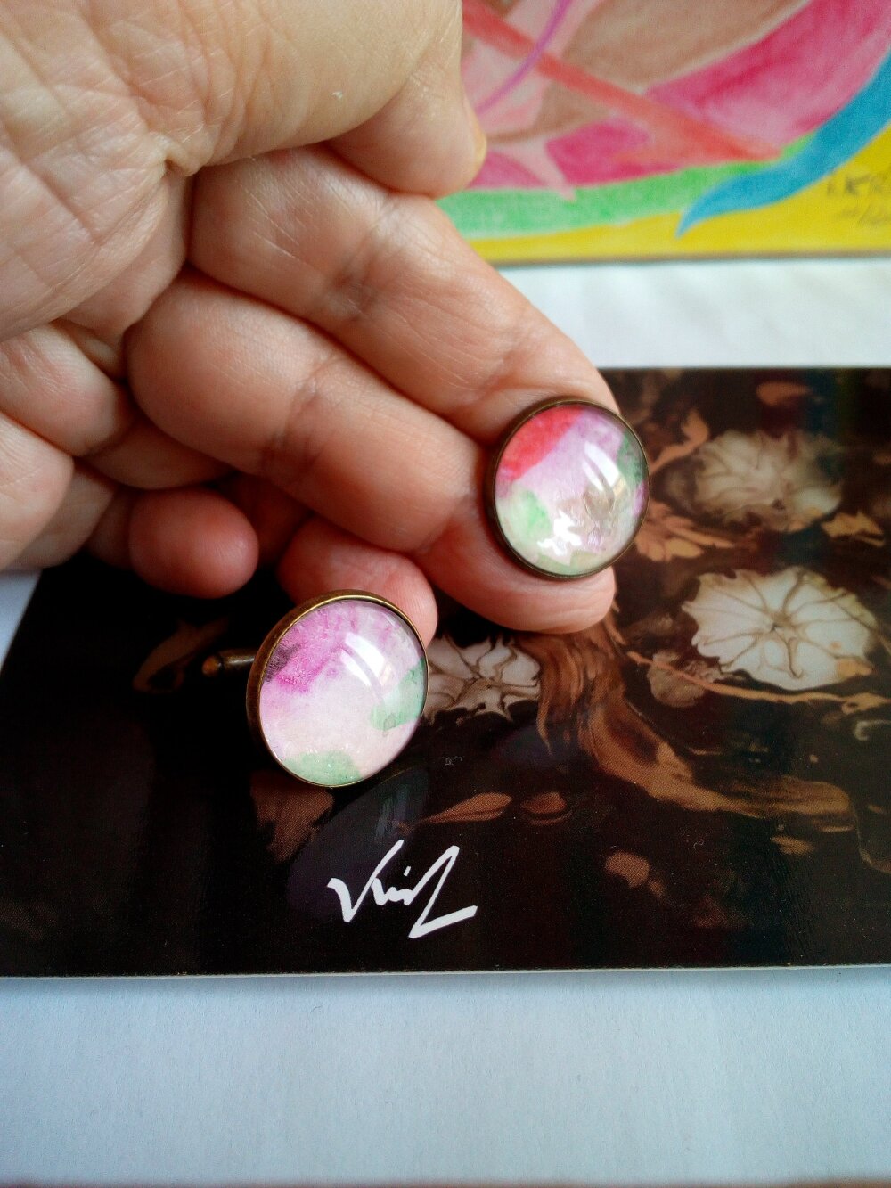 aquarelle originale ,boutons de manchette ronds,rouge rose vert bronze,bobo boho gothique,cadeau fete noel
