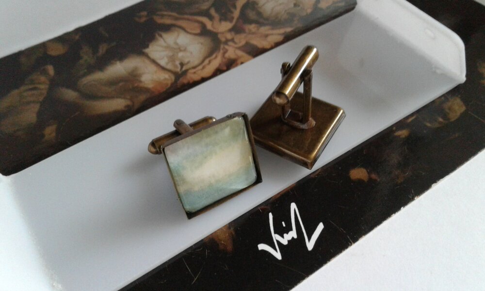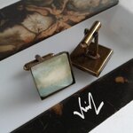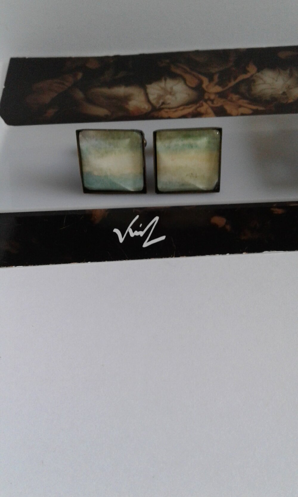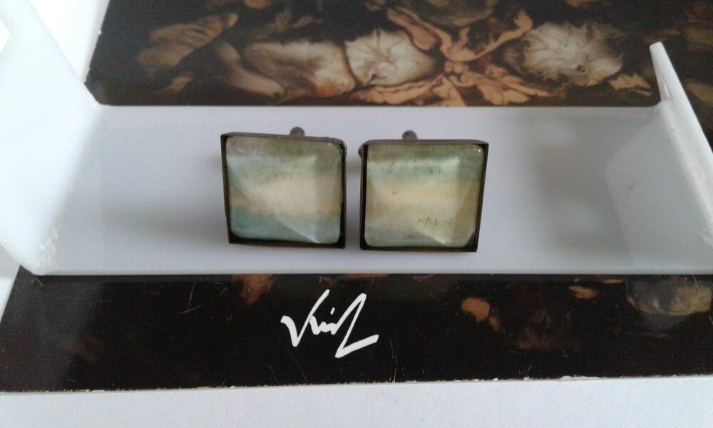 Boutons de manchette carre en laiton avec aquarelle ooak peint par artiste,bleu jaune vert,accessoire costume cravate,fait mains en france