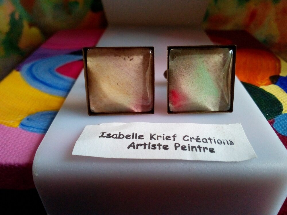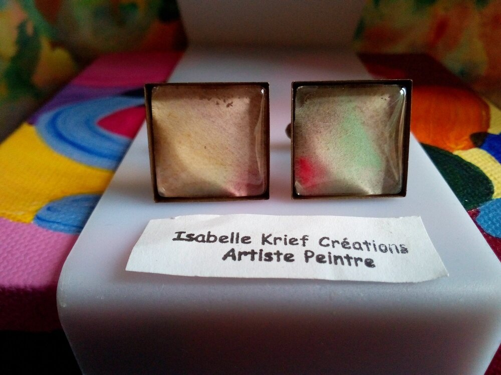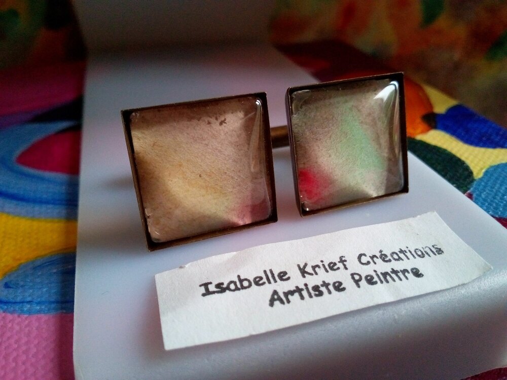 Boutons de manchette carres en laiton bronze avec cabochons aquarelle peints par artiste,fait mains en france,cadeau fete anniversaire noel,