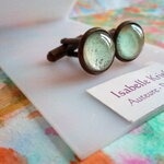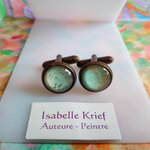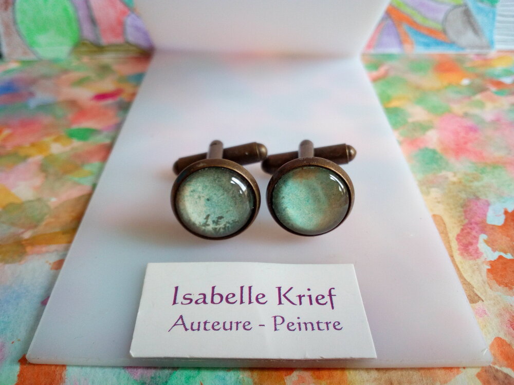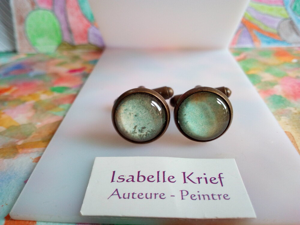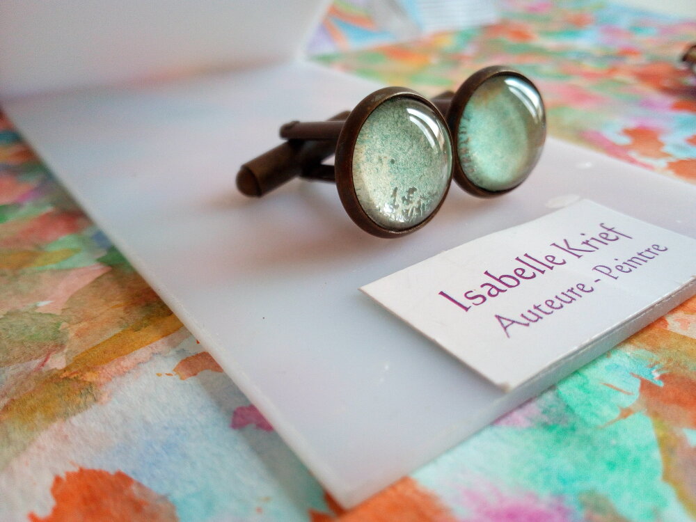 Boutons de manchette laiton avec cabochons ronds aquarelle ooak peint artiste art abstrait,fait mains en france,cadeau fete anniversaire noel,