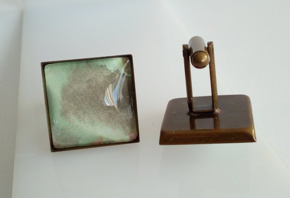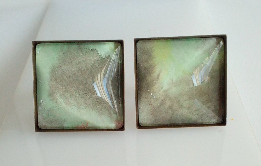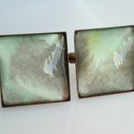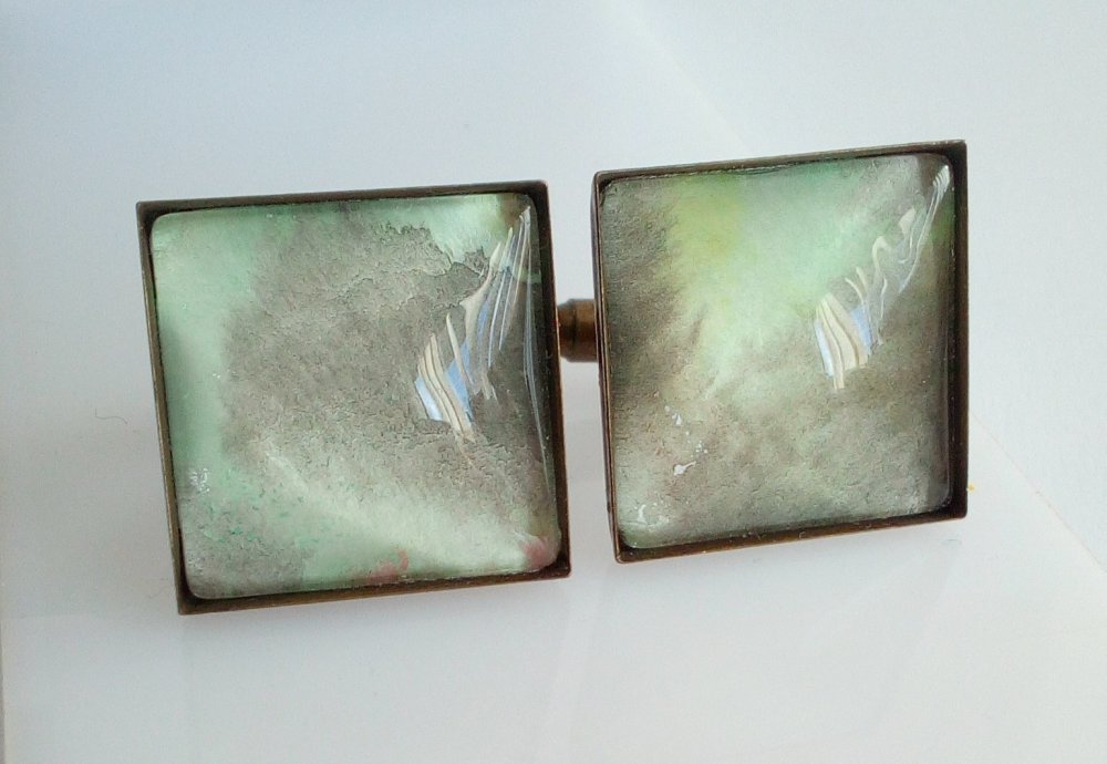 Boutons de manchette laiton bronze,aquarelle vert noir gris,peint artiste francaise,cabochons carrés en verre,accessoire costume cravate,cadeau fete anniversaire noel,boho bobo art deco,fait mains en france,