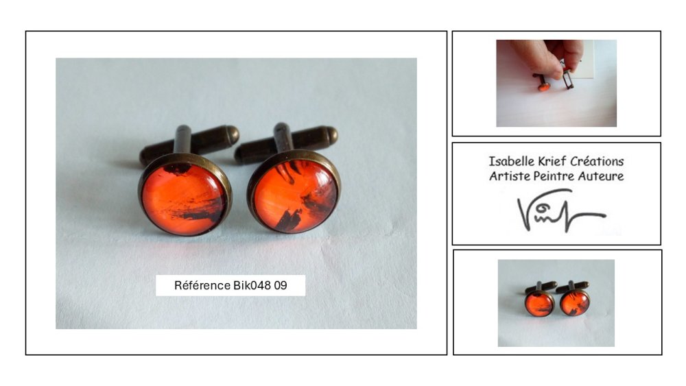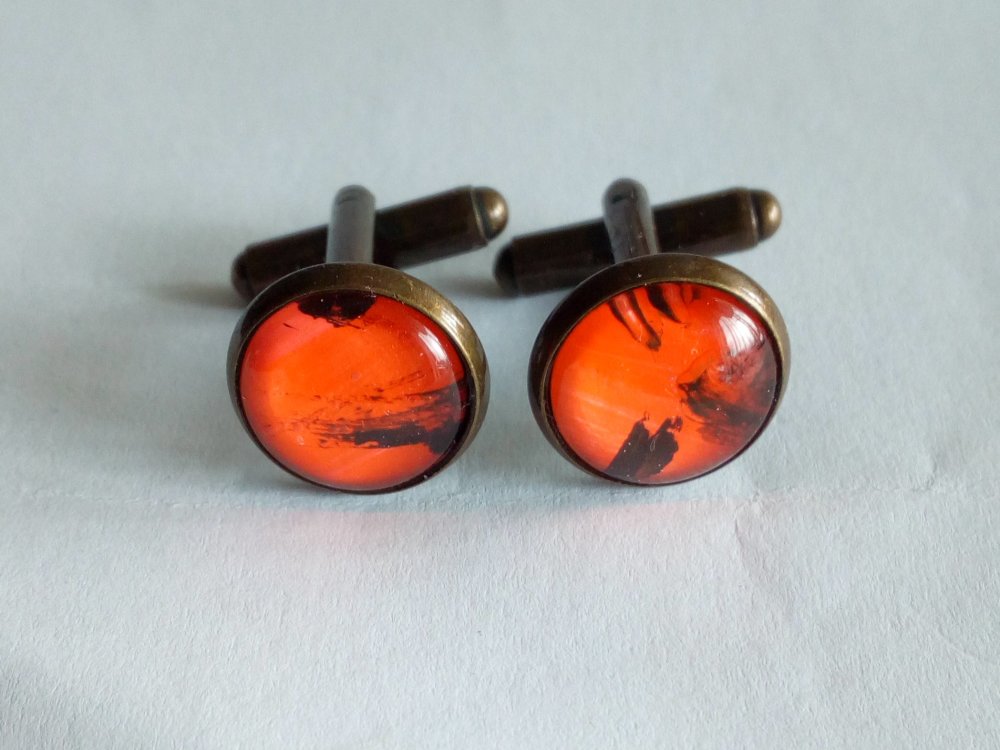 Boutons de manchette en laiton bronze avec cabochons en verre rond, peinture orange noir,art abstrait contemporain,accessoire costume ceremonie,cadeau homme,fete anniversaire noel,fait mains en france,pièce unique,