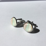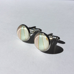 Boutons de manchette chics et élégants composés d'un support en métal argenté coiffé d'un cabochon de verre bombé de 14 mm. Le motif du cabochon est un motif géométrique aux couleurs douces (rose et vert très pâle et blanc) séparées par de fins liserets dorés.