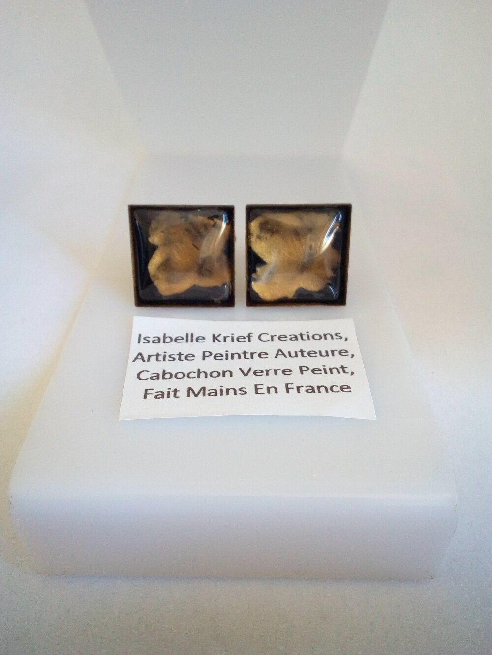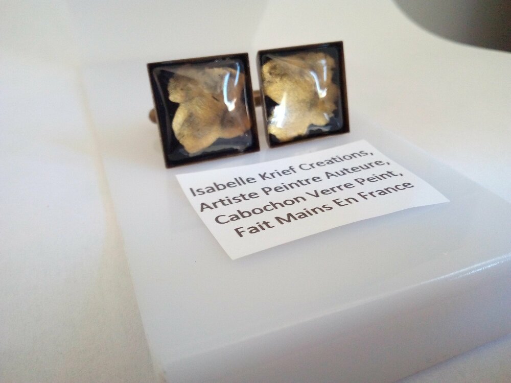 Boutons de manchettes laiton bronze avec cabochon carres en verre peint par artiste,fait mains en france,cadeau fete anniversaire noel,