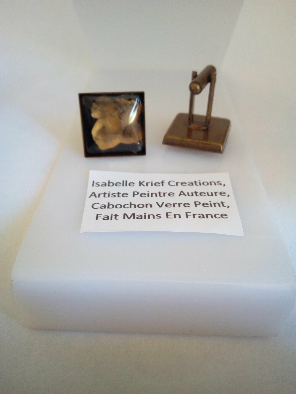 matériau : laiton bronze,verre loupe,peinture,mes mains, ma technique ,cabochons carre 20mm en verre loupe,