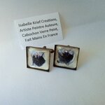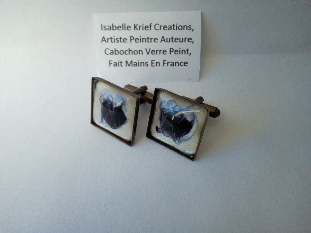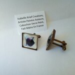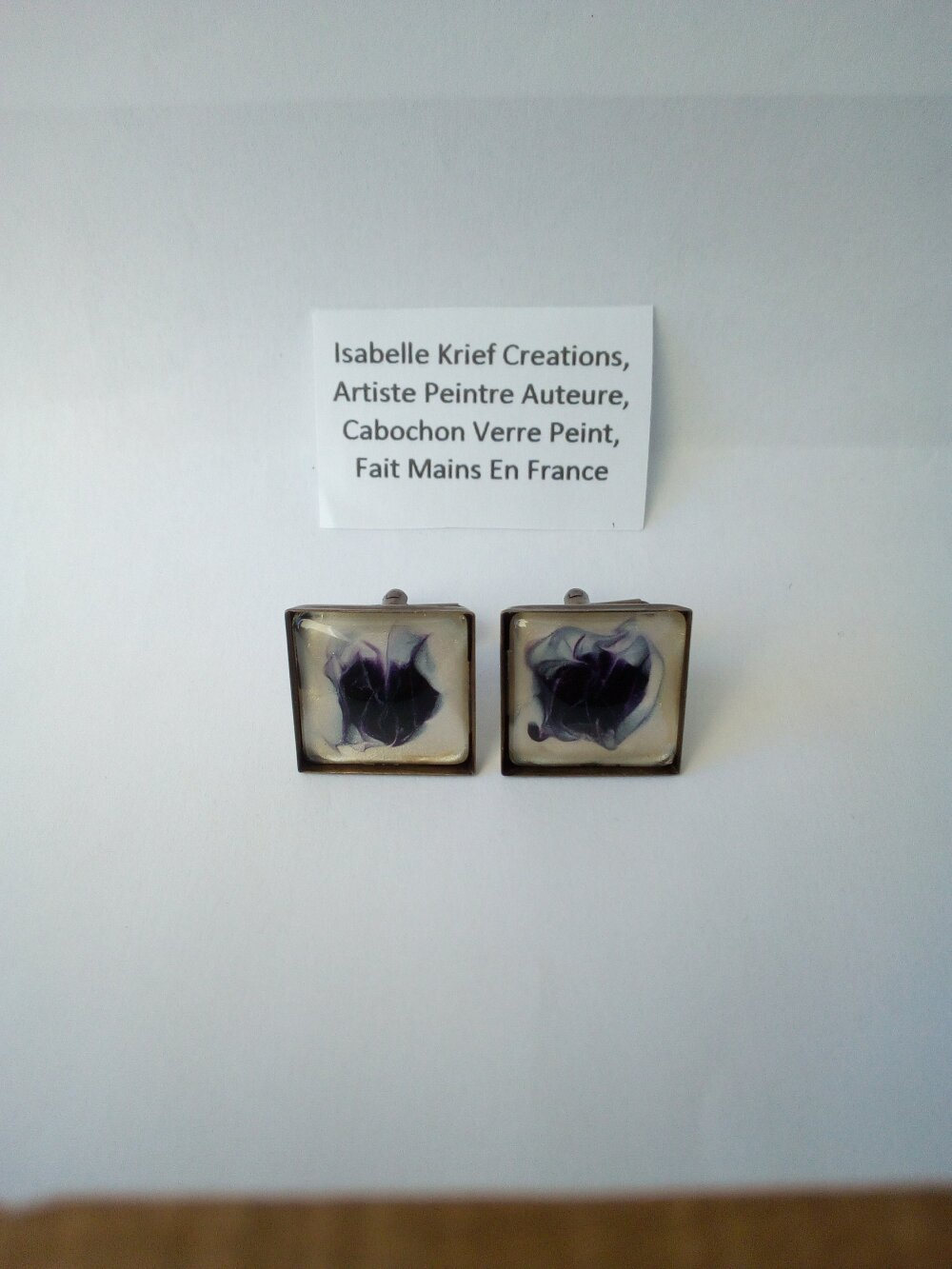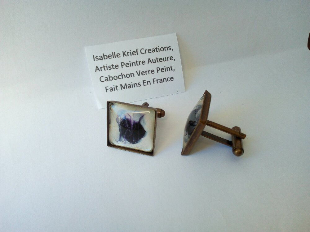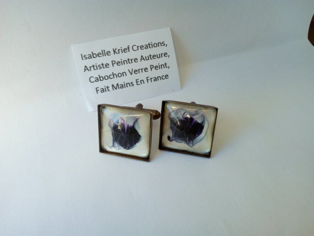 Boutons de manchettes laiton bronze avec cabochon carres en verre peint violet nacre par artiste,fait mains en france,cadeau fete anniversaire noel,