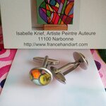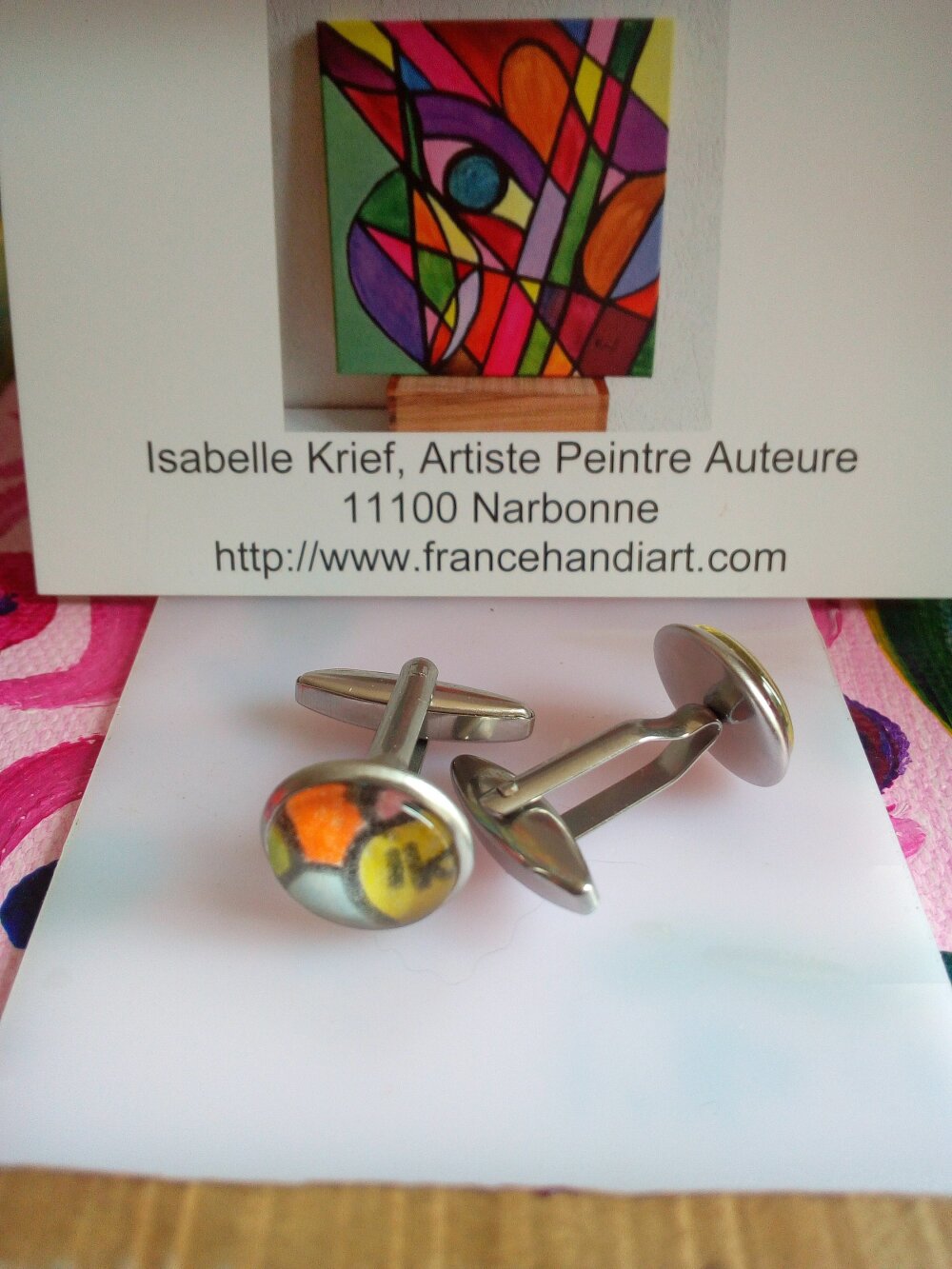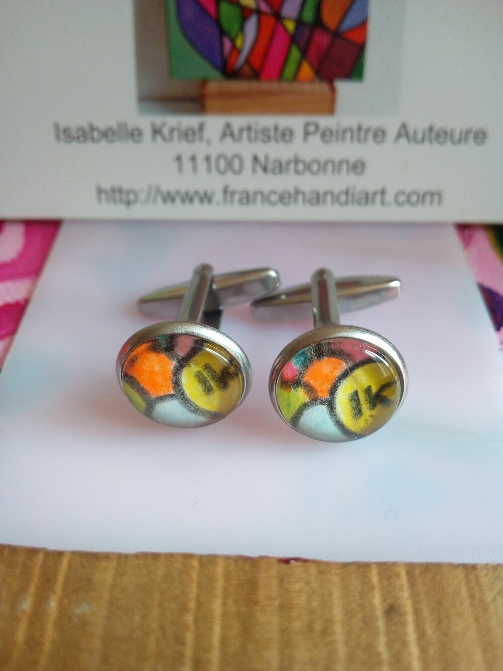 peint artiste française,boutons de manchettes ronds en acier inoxydable avec aquarelle originale bleu rose vert orange jaune rouge,
