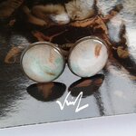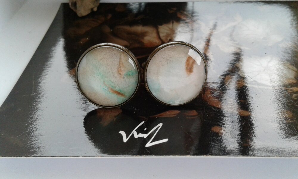 Bonjour, voici un de mes morceaux d'aquarelle originale découpée en 2 cabochons ronds de 20mm de diamètre que j'ai collés sur des supports boutons de manchettes en laiton bronze,