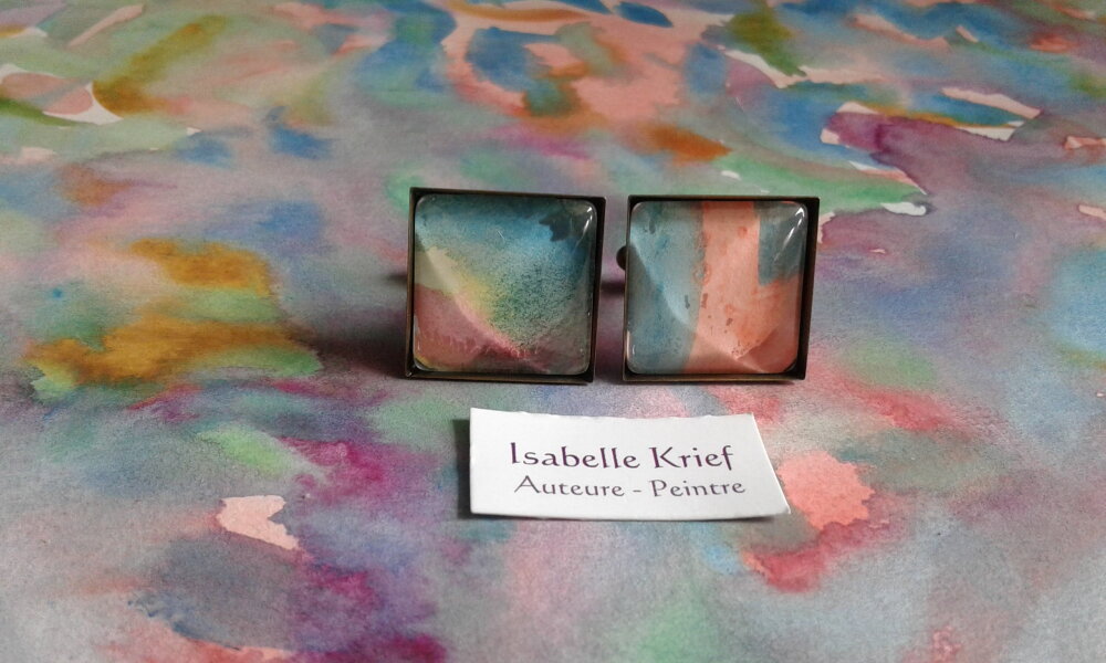 Boutons manchette laiton bronze avec cabochons carres aquarelle