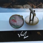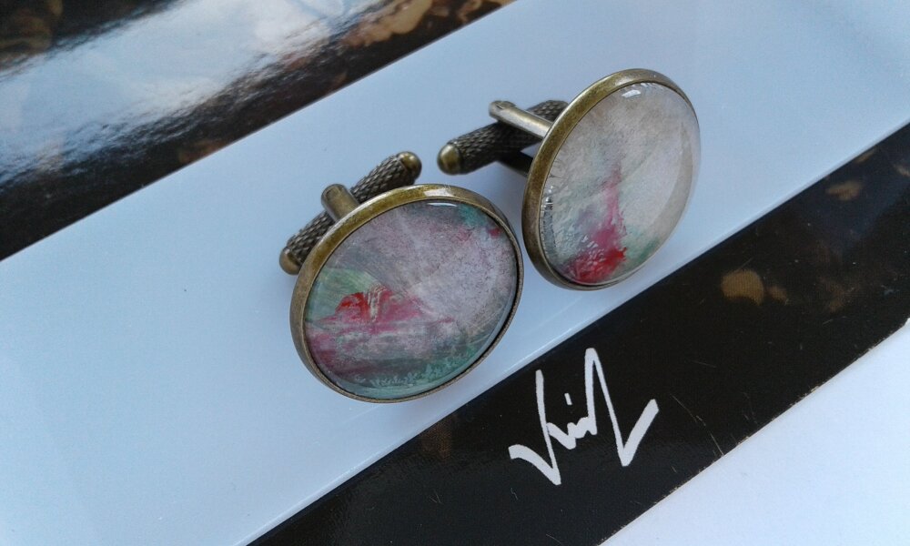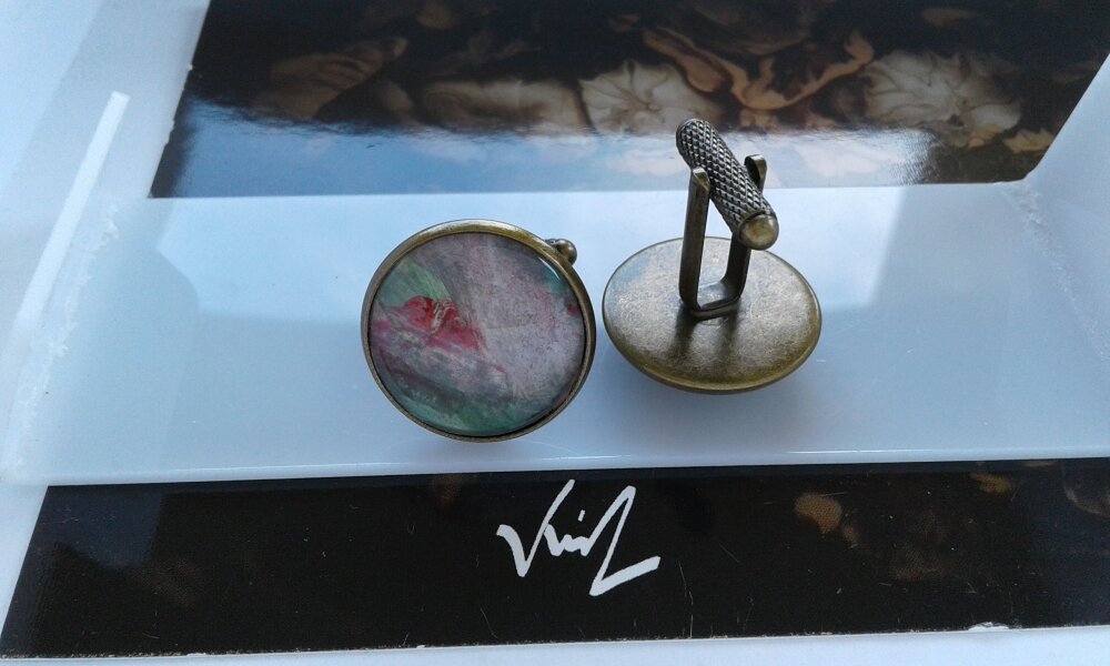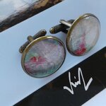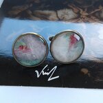 Bonjour, voici une paire de boutons de manchette, laiton bronze, que j'ai réalisée avec 2 de mes morceaux d'aquarelle originale découpée en cabochons ronds 20 mm de diamètre,