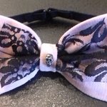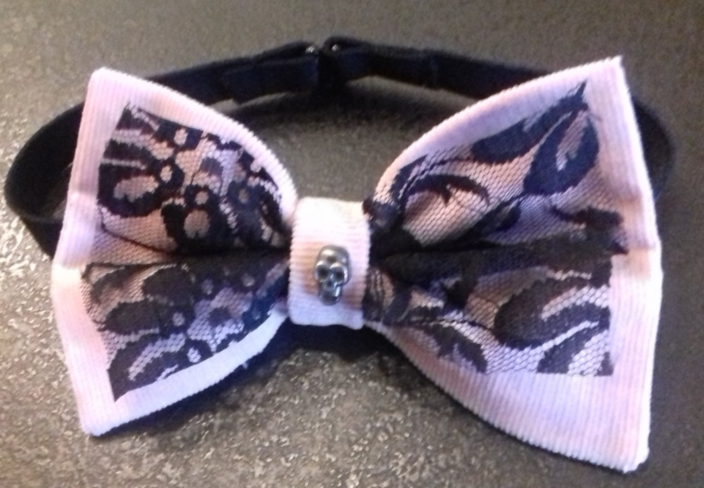 Noeud papillon fait main en velours ,couleur vieux rose agrémenté d'une dentelle noire et orné d un bouton tête de mort