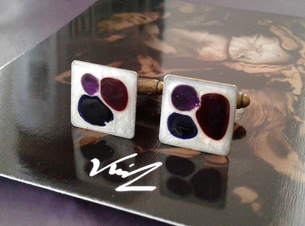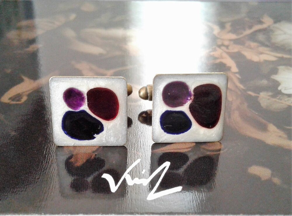 peint par artiste française,boutons manchette carré bronze,nacre bleu blanc rouge fushia,art contemporain modern,gothique boheme hippie,