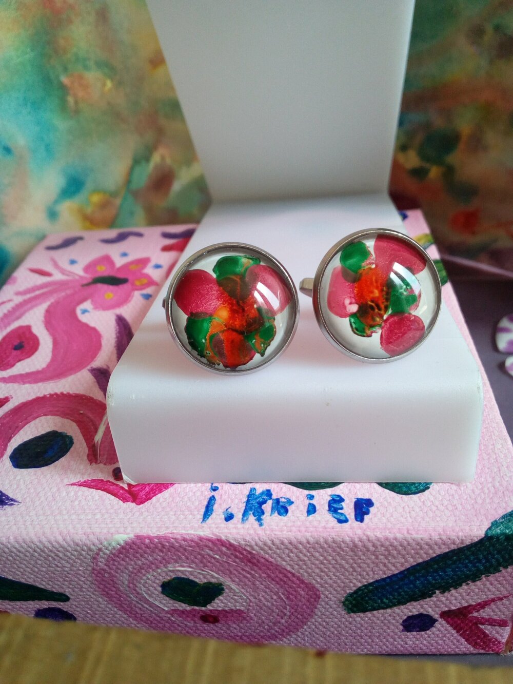 Peint artiste isabelle k,boutons de manchette acier avec cabochons ronds rouge rose orange vert blanc,cadeau fete anniversaire noel,boho