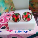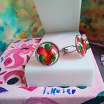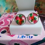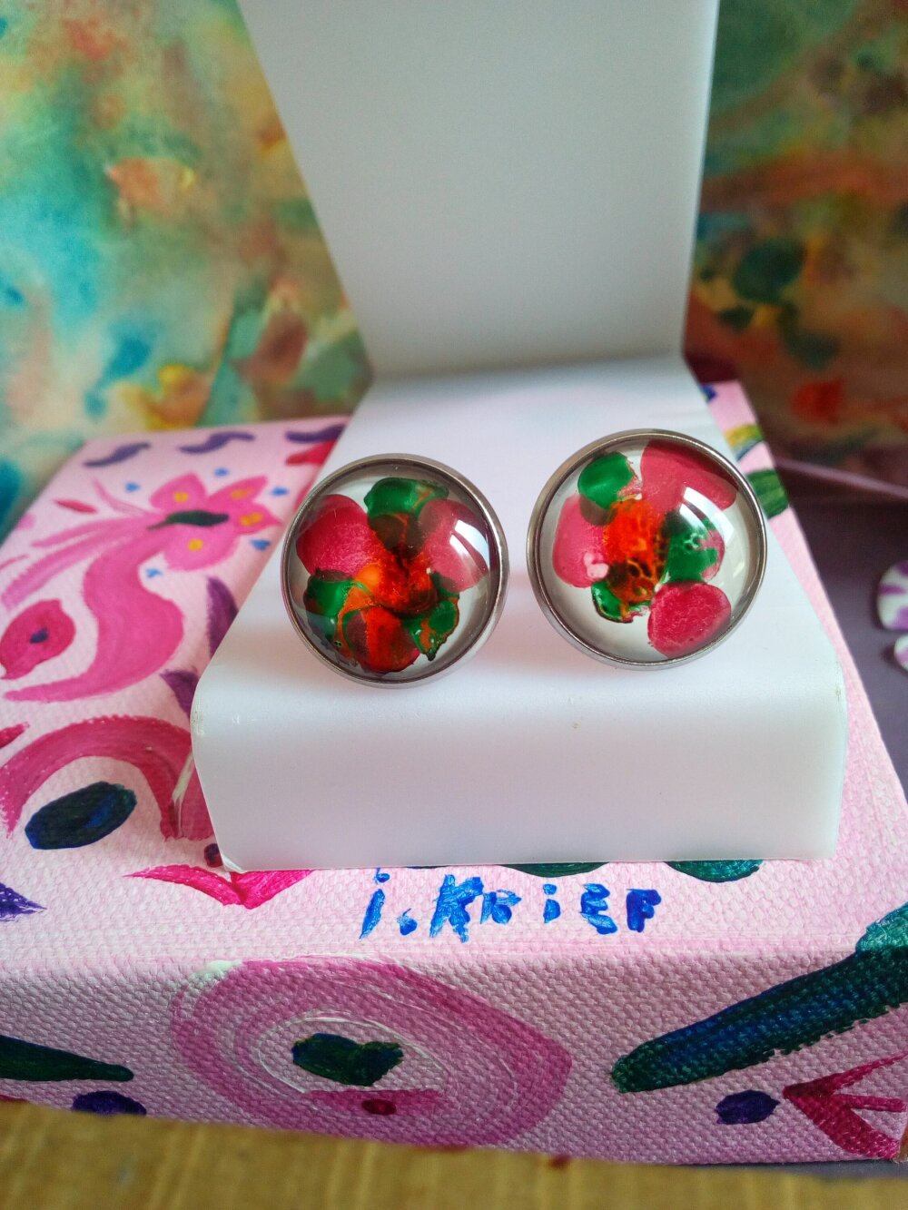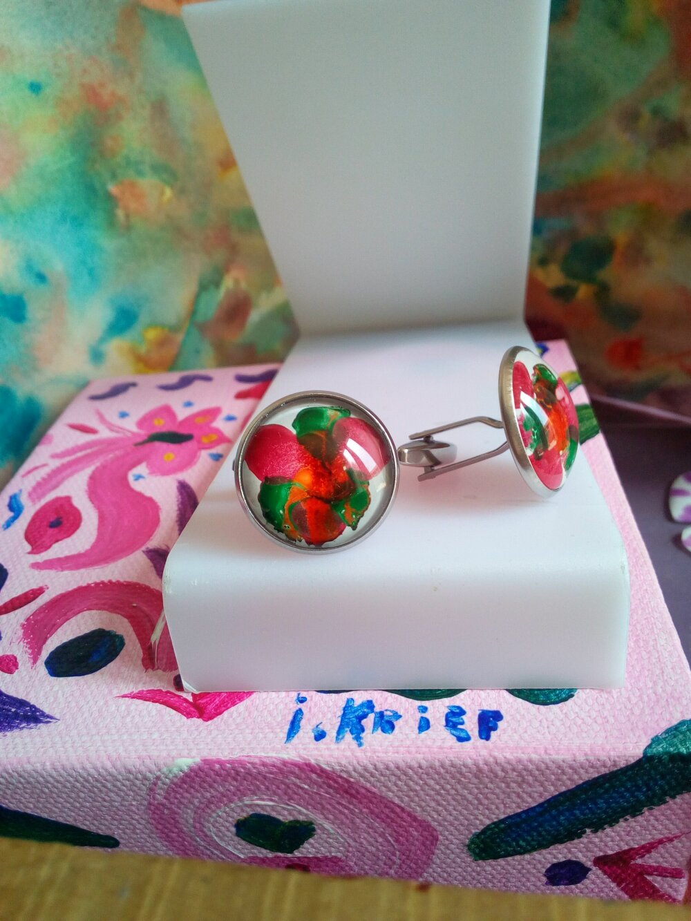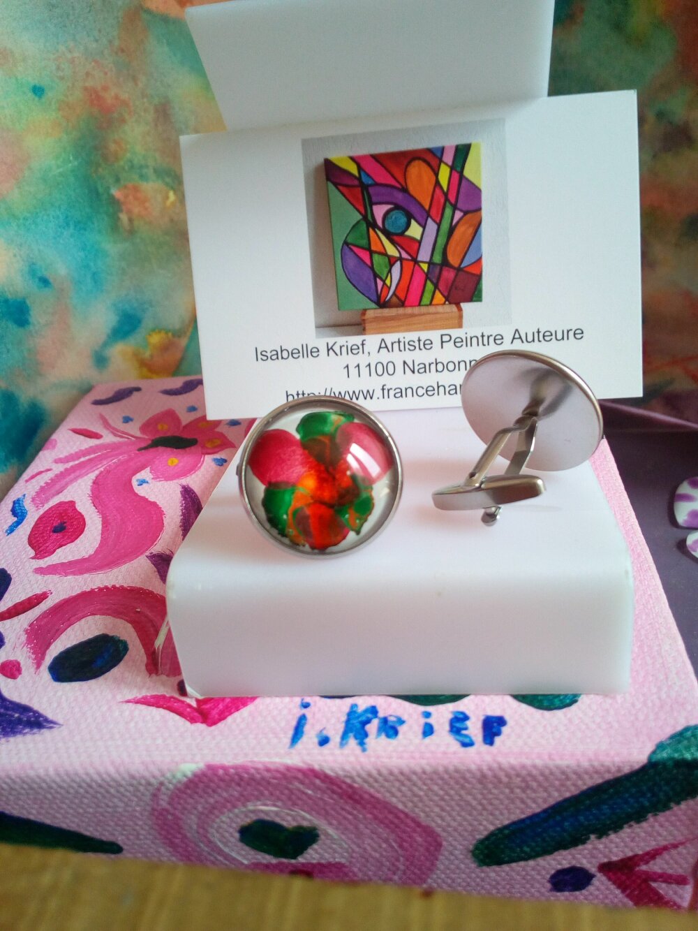 Peint artiste isabelle k,boutons de manchette acier avec cabochons ronds rouge rose orange vert blanc,cadeau fete anniversaire noel,