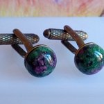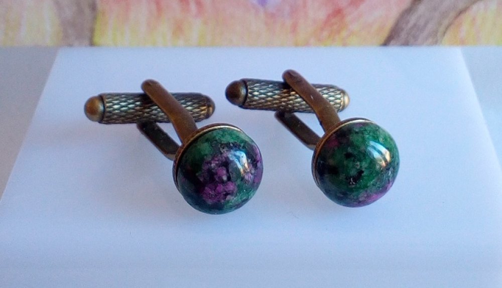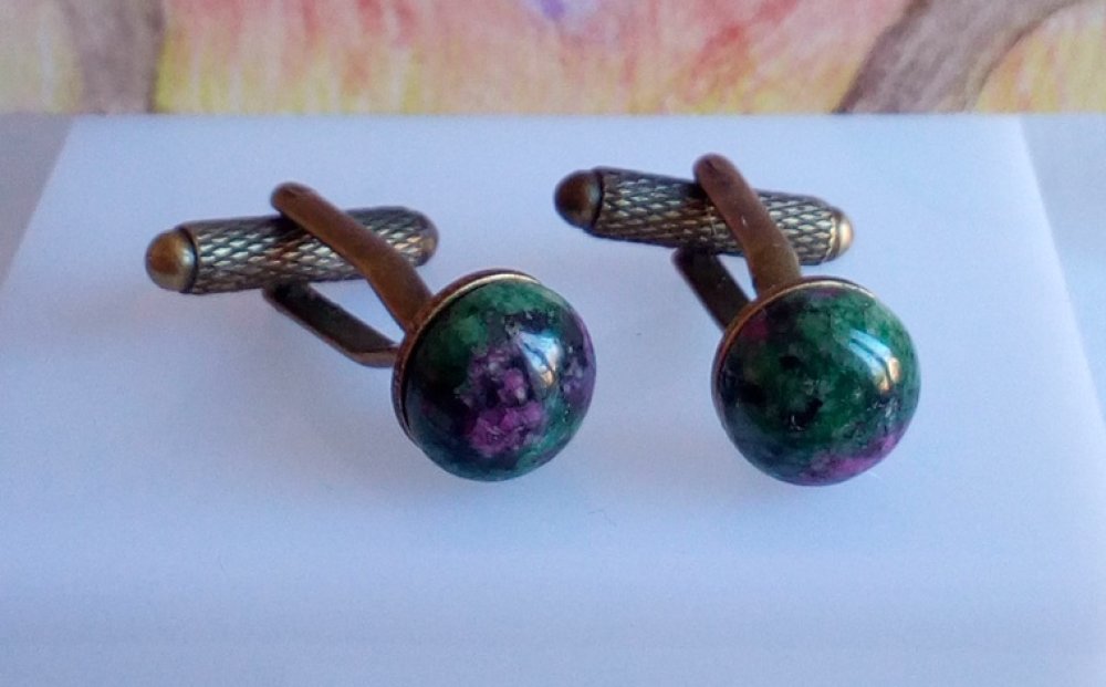 Rubis zoisite,Boutons de manchettes laiton bronze avec cabochons ronds dia 10mm, pierre semi precieuse rose vert, fait mains en france, cadeau fete anniversaire noel, accessoire costume chemise, bijou homme femme unisexe,bobo bobo gothique lgbt,