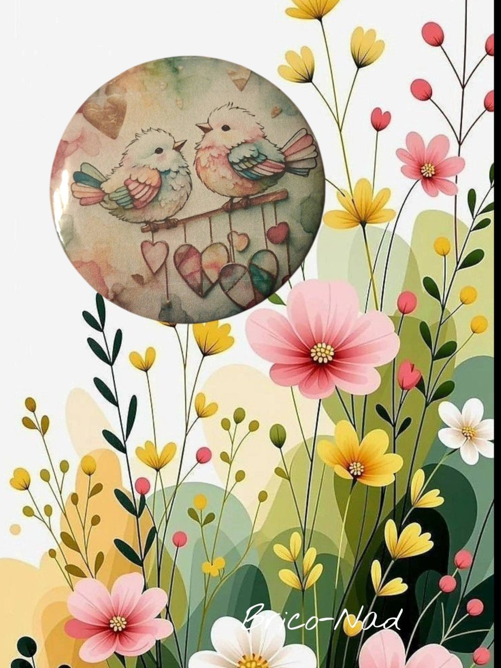 Ce joli badge illustré avec son duo d’oiseaux pastel et ses petits cœurs apportera une touche douce et romantique à vos clés ou à votre sac 💝