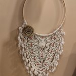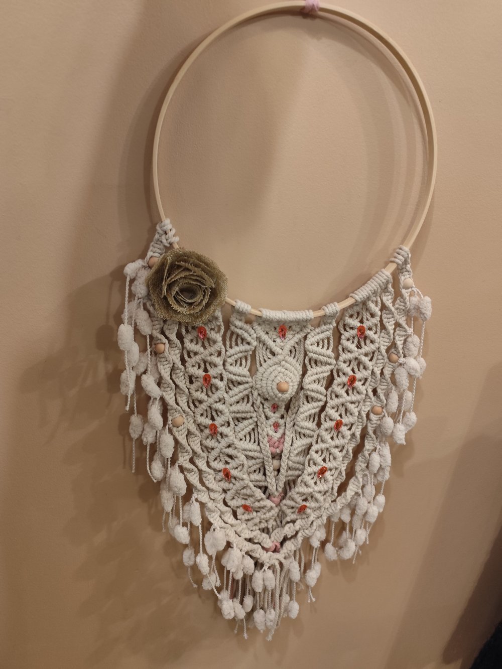 c'est une tenture unique en macramé , nouée à la main et composée de coton et d'un cercle en bois et ornée d'une rose en toile .