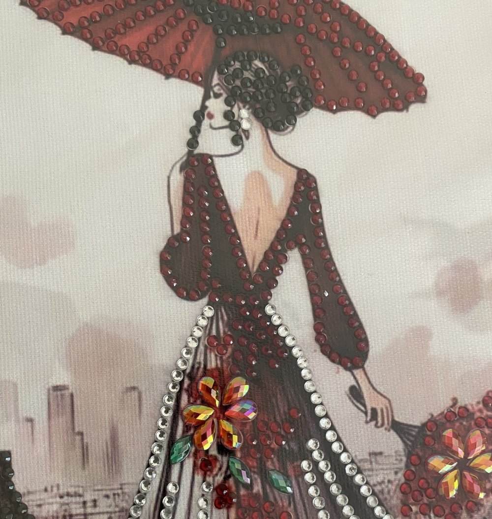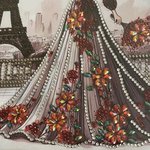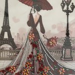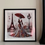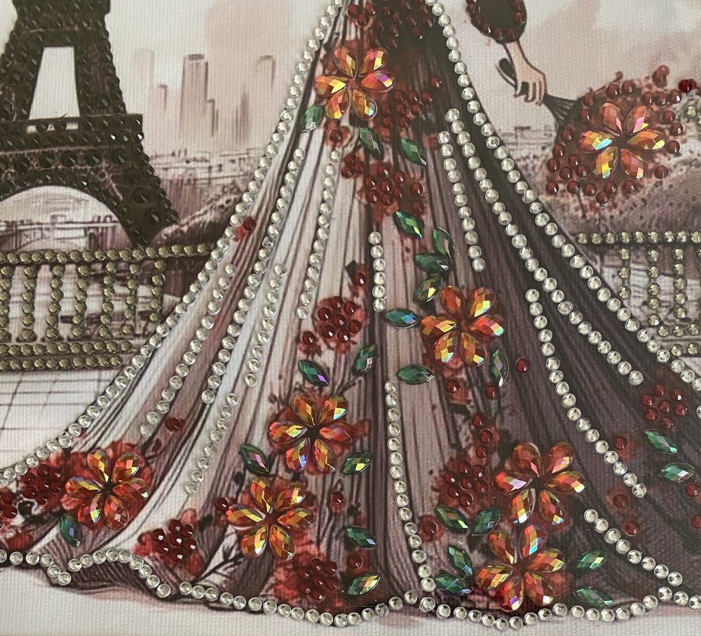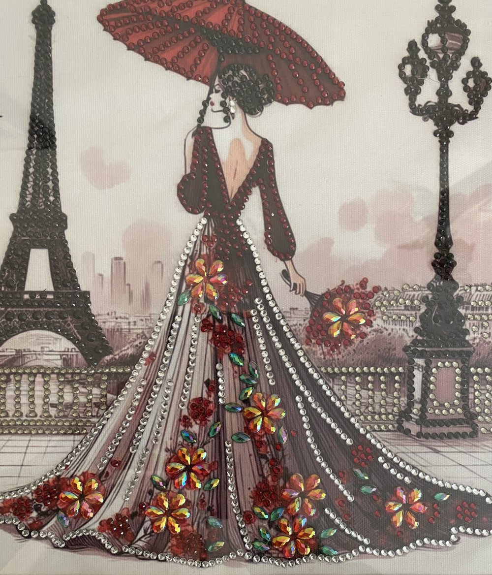 - Magnifique diamants painting, plein de charme, très détaillé et coloré, mettant en scène une femme élégante en robe fleurie rouge face à la Tour Eiffel. Les strass multicolores ainsi que les perles, posés partiellement, donnent un effet lumineux raffiné et donnent beaucoup de relief. Il y a plusieurs photos car couleurs différentes en fonction de la lumière. Reflets plus brillants au naturel.