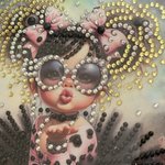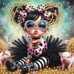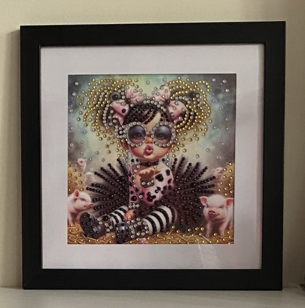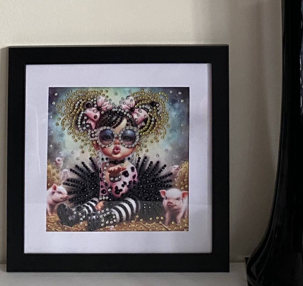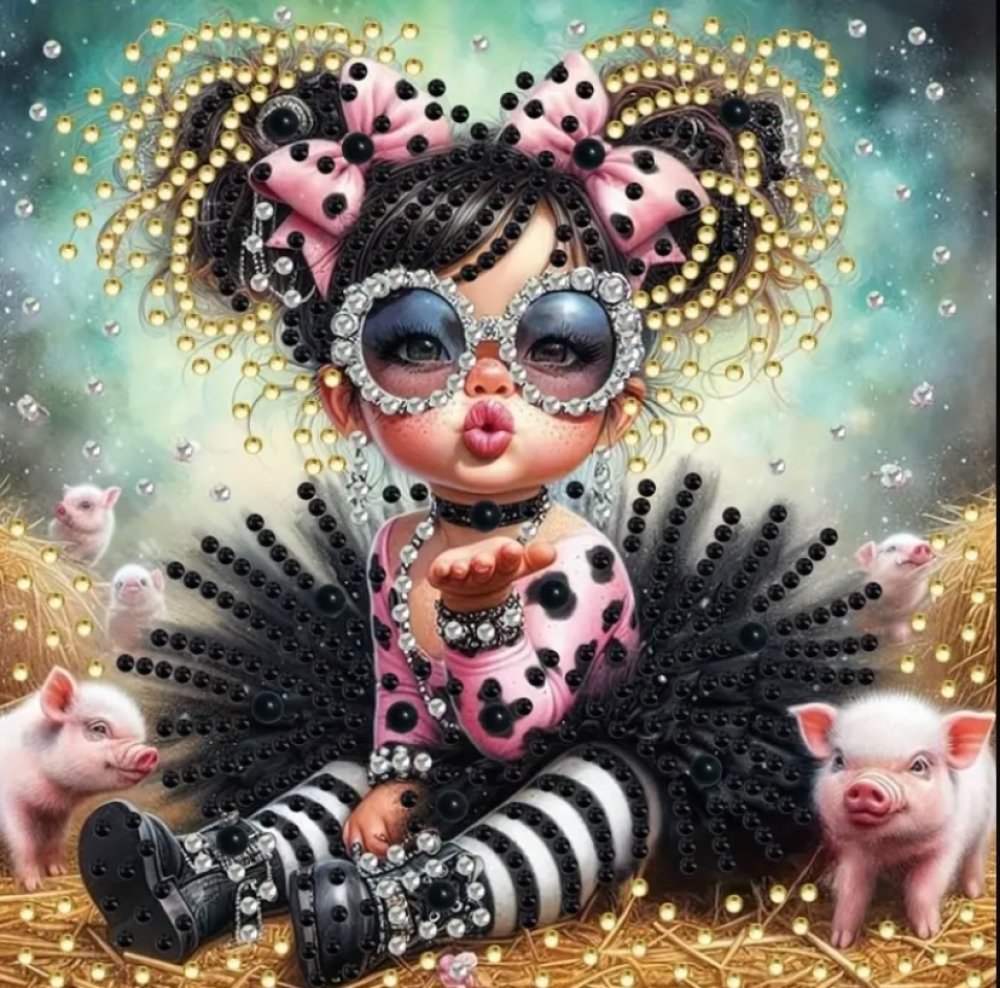 - Adorable tableau diamants painting, pétillant et plein de fantaisie, très détaillé et coloré, illustrant une adorable fillette en tenue chic et originale, entourée de petits cochons. Elle fait fondre par son charme et ses détails en strass étincelant. Les strass ainsi que les perles, posés partiellement, font briller la scène avec raffinement. Il y a plusieurs photos car couleurs différentes en fonction de la lumière. Reflets plus brillants au naturel.