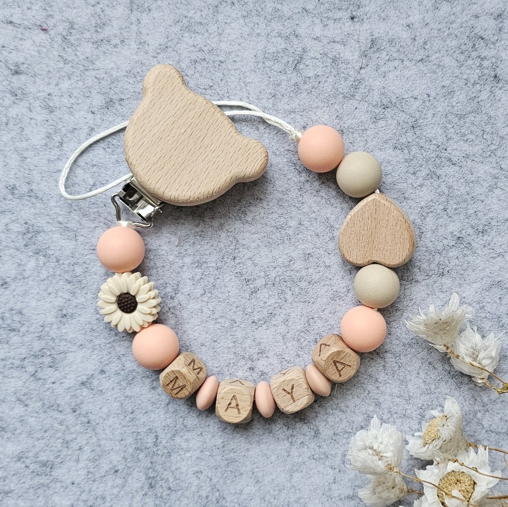 Attache tétine en bois et silicone à personnaliser avec le prénom de bébé.