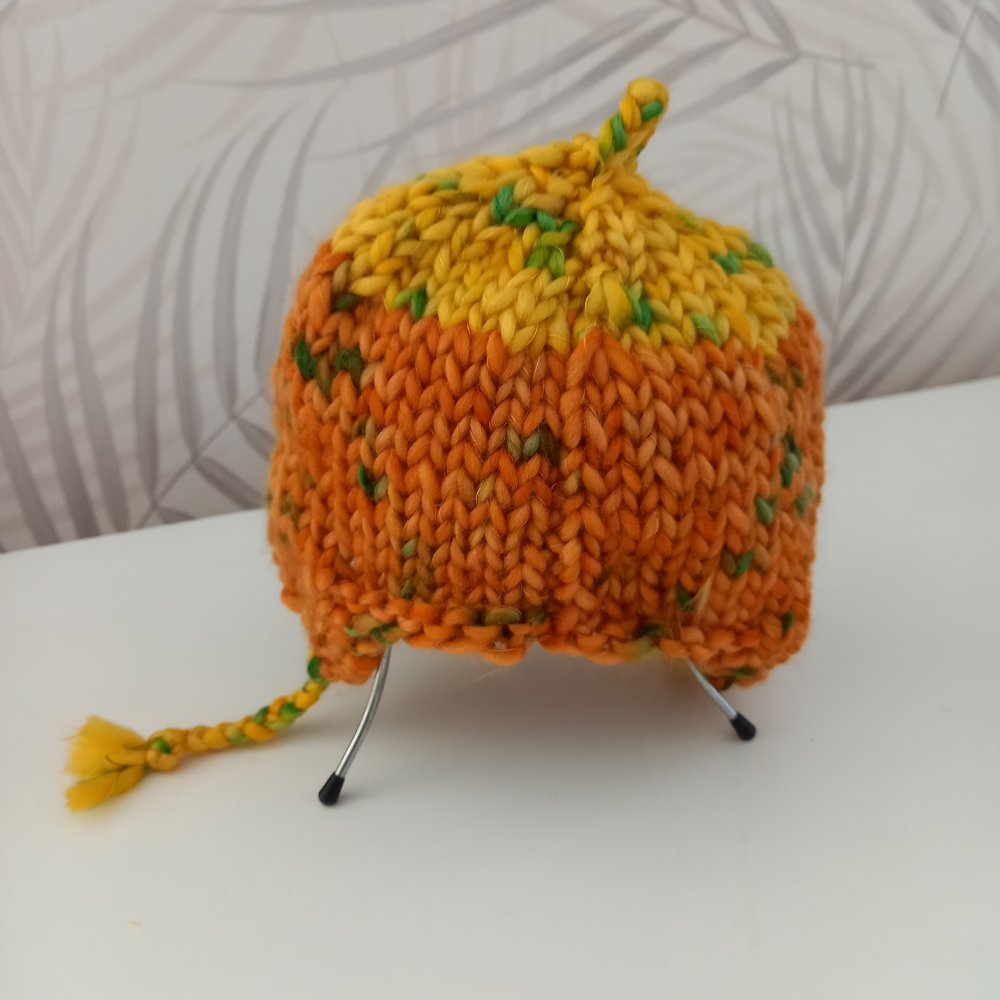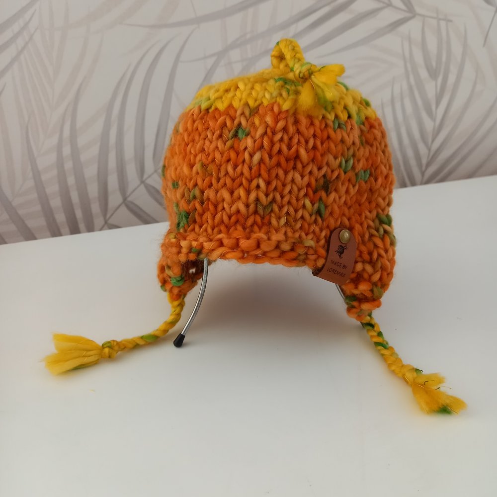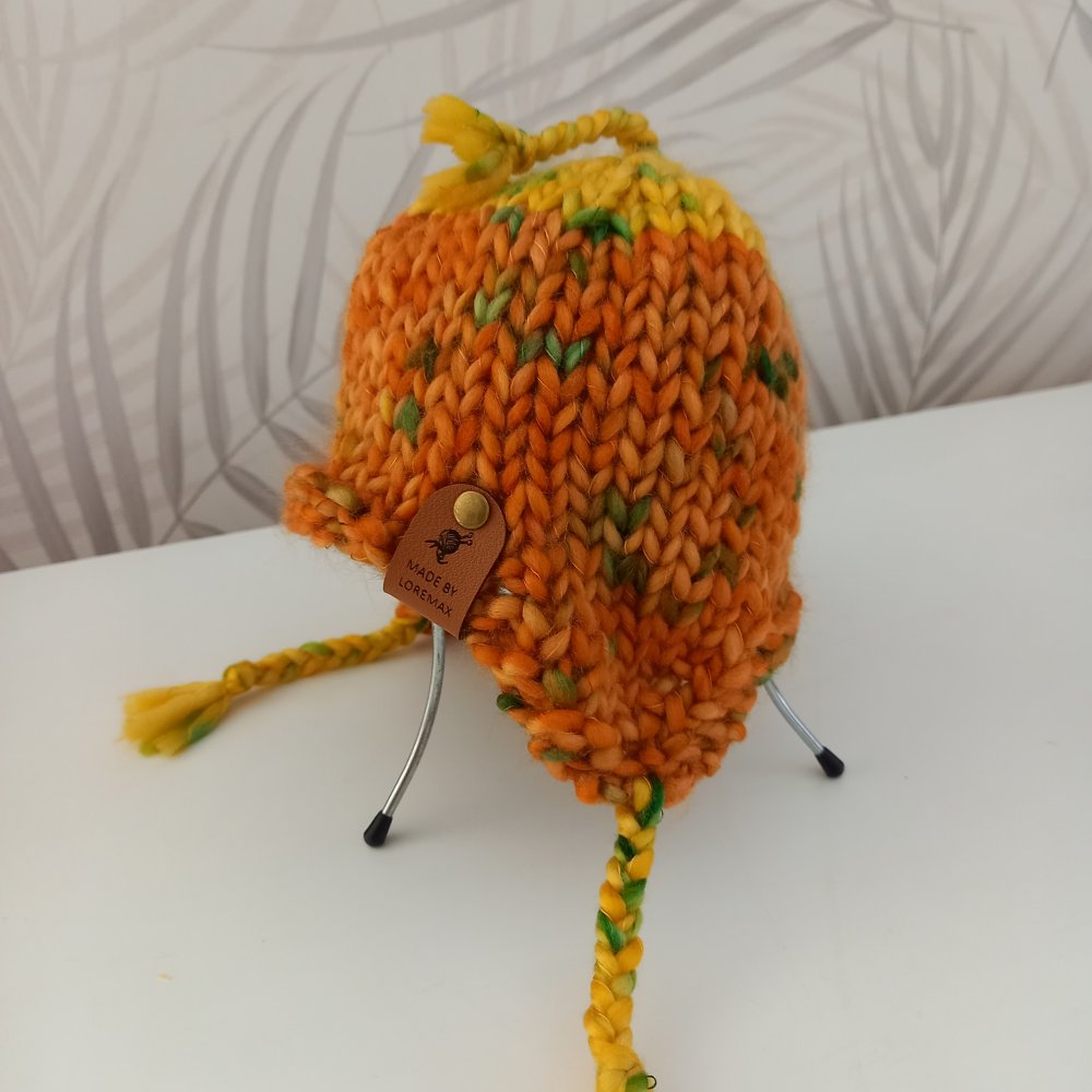 Bonnet bébé laine jaune et orange avec oreilles tricoté main