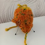 Bonnet bébé laine jaune et orange avec oreilles tricoté main.