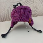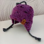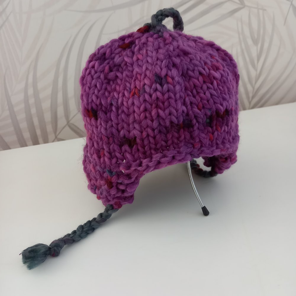 Bonnet bébé laine violette avec oreilles tricoté main.