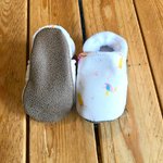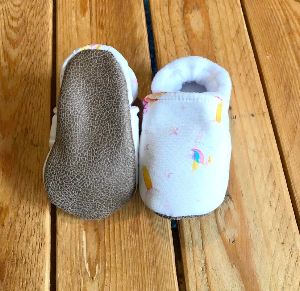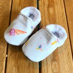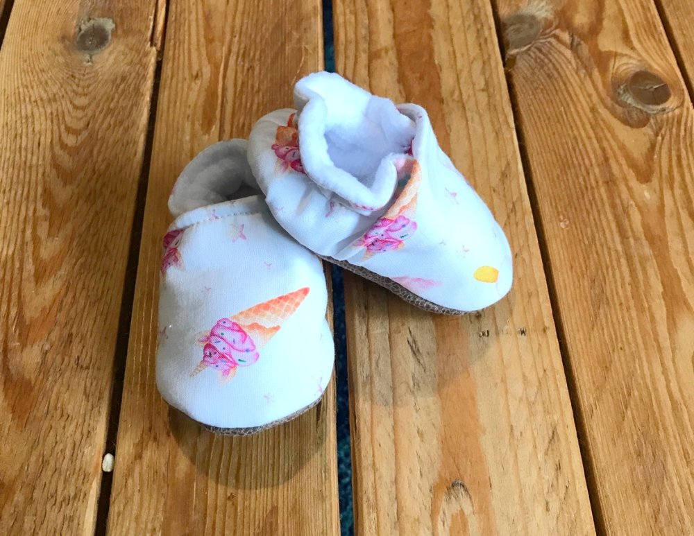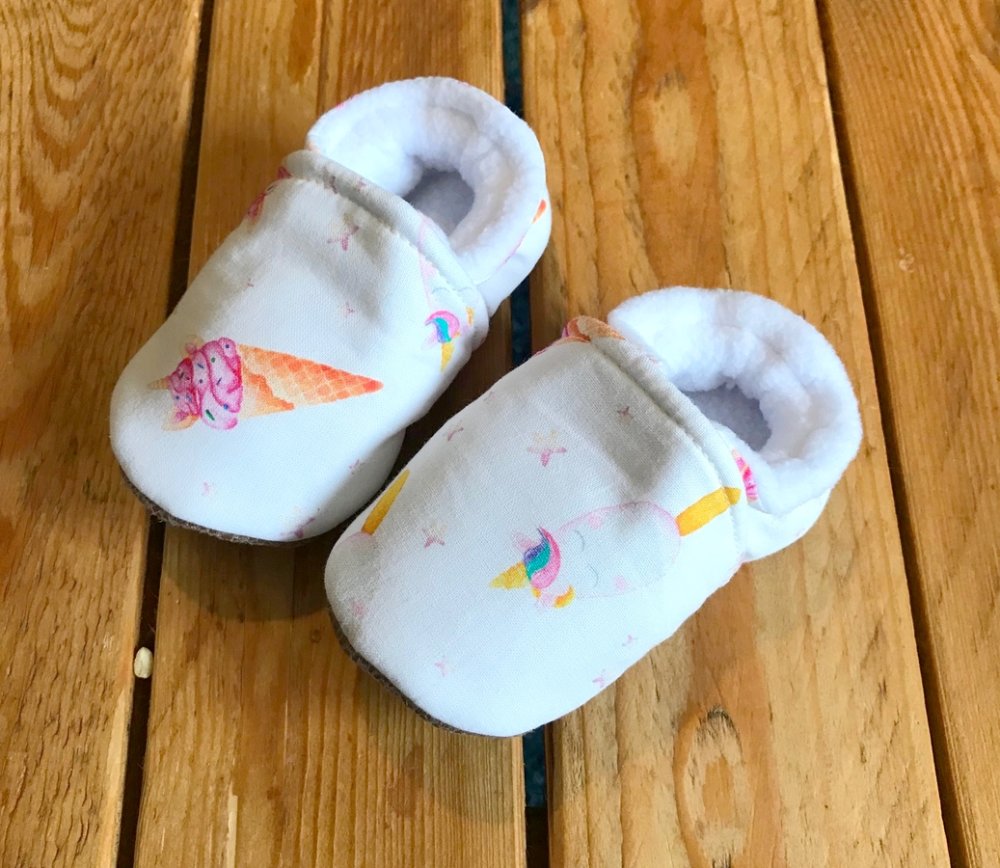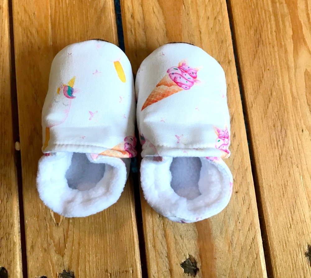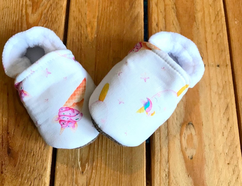 Chaussons souples bebe en coton et semelle antidérapante en suédine, motifs glaces licorne doublés en polaire, chaussons de portage