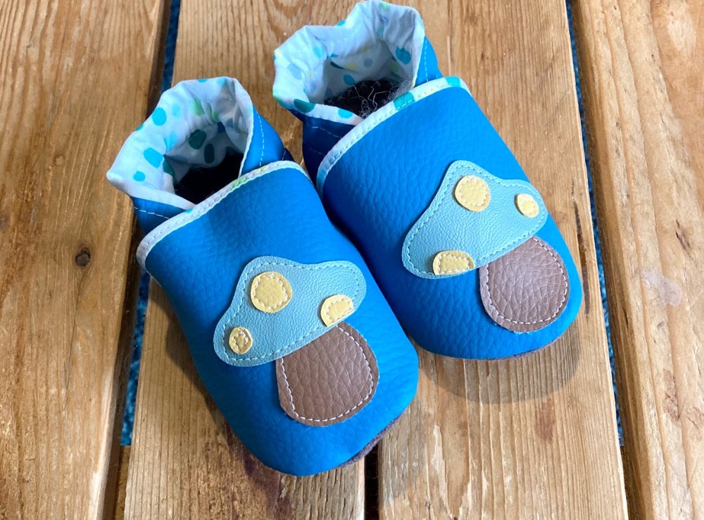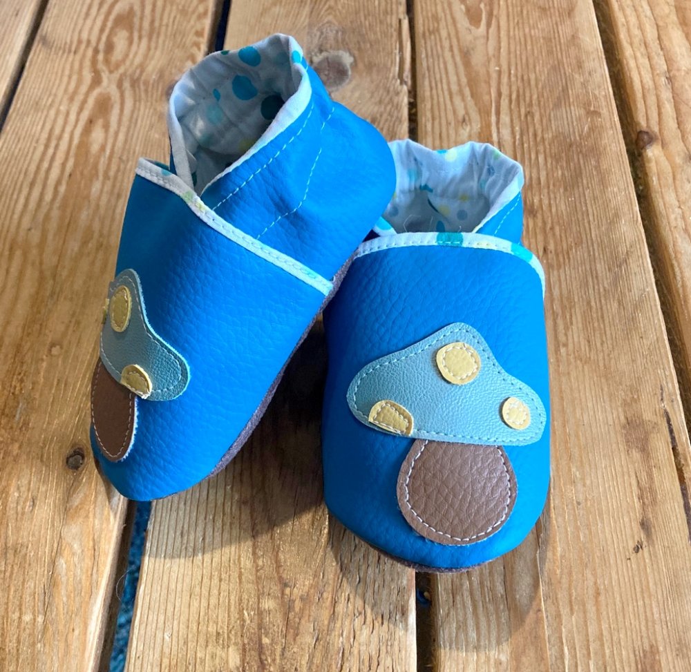 Chaussons souples bleu bébé, simili cuir et polaire , theme champignons, doublés polaire ou coton au choix, chaussons de portage