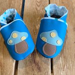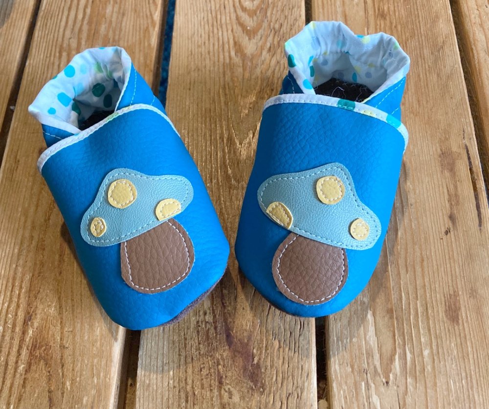 une paire de chaussons en simili cuir "bleu canard" , appliqués champignons