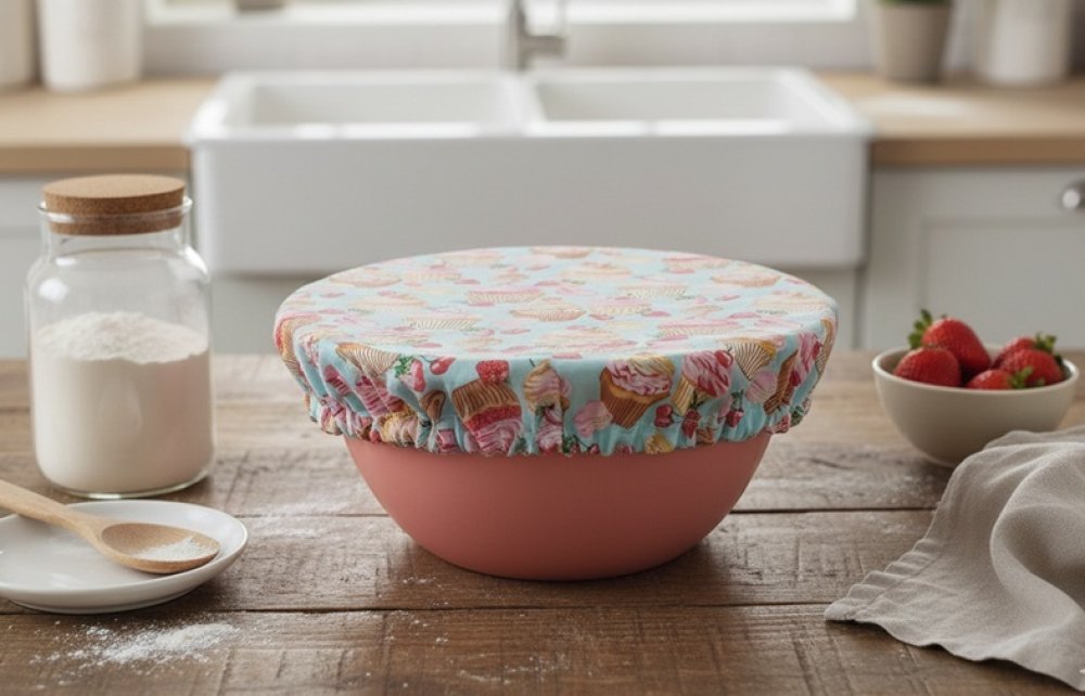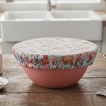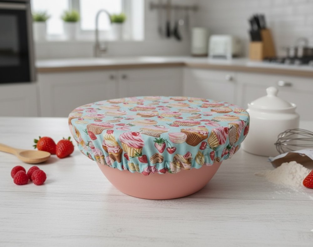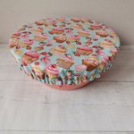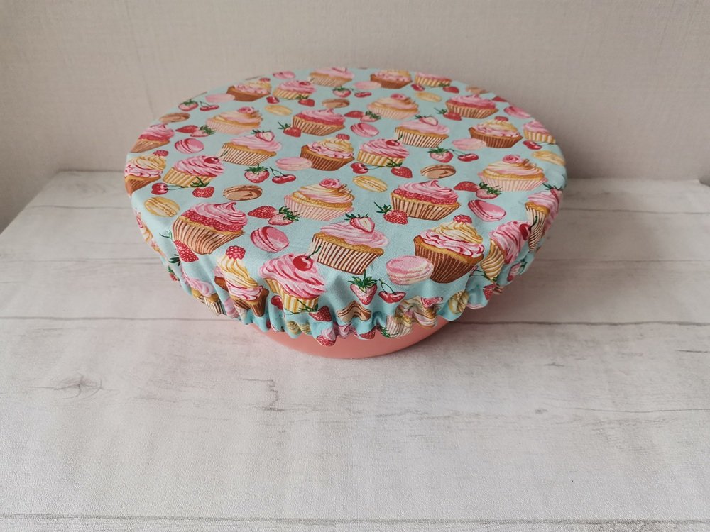 Charlotte alimentaire/couvre plat réalisé avec du tissu coton certifié Oeko-Tex motif gâteaux sur fond bleu et doublé en tissu PUL, spécialement conçu pour un contact alimentaire sans transfert de substances nocives. Le PUL est également imperméable, préservant ainsi la fraîcheur de vos préparations.