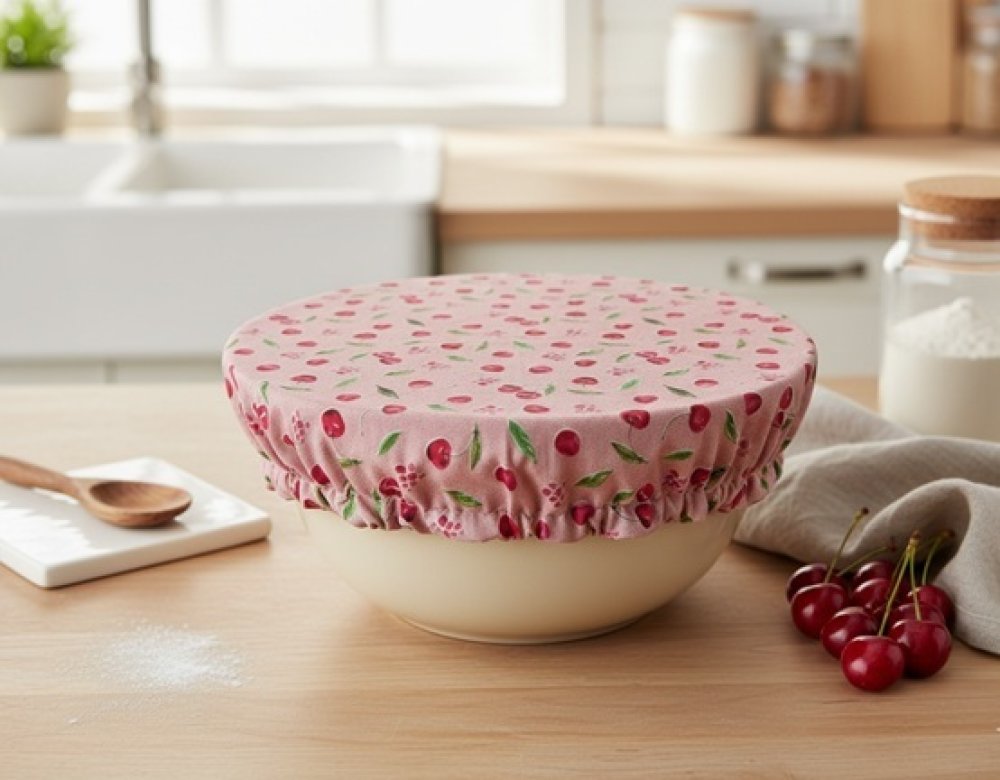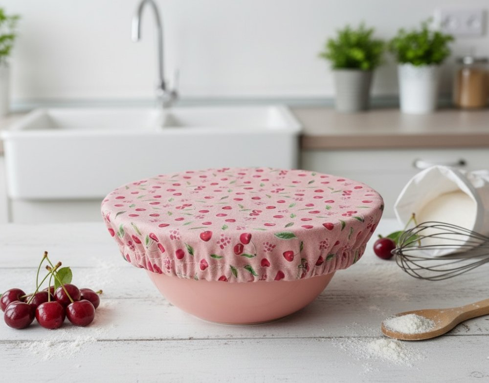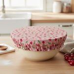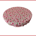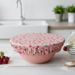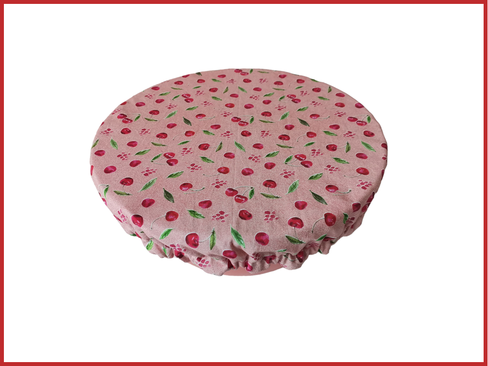 Charlotte alimentaire/couvre plat réalisé avec du tissu coton certifié Oeko-Tex motif cerises sur fond rose et doublé en tissu PUL, spécialement conçu pour un contact alimentaire sans transfert de substances nocives. Le PUL est également imperméable, préservant ainsi la fraîcheur de vos préparations.