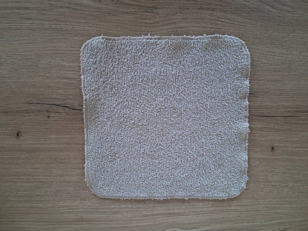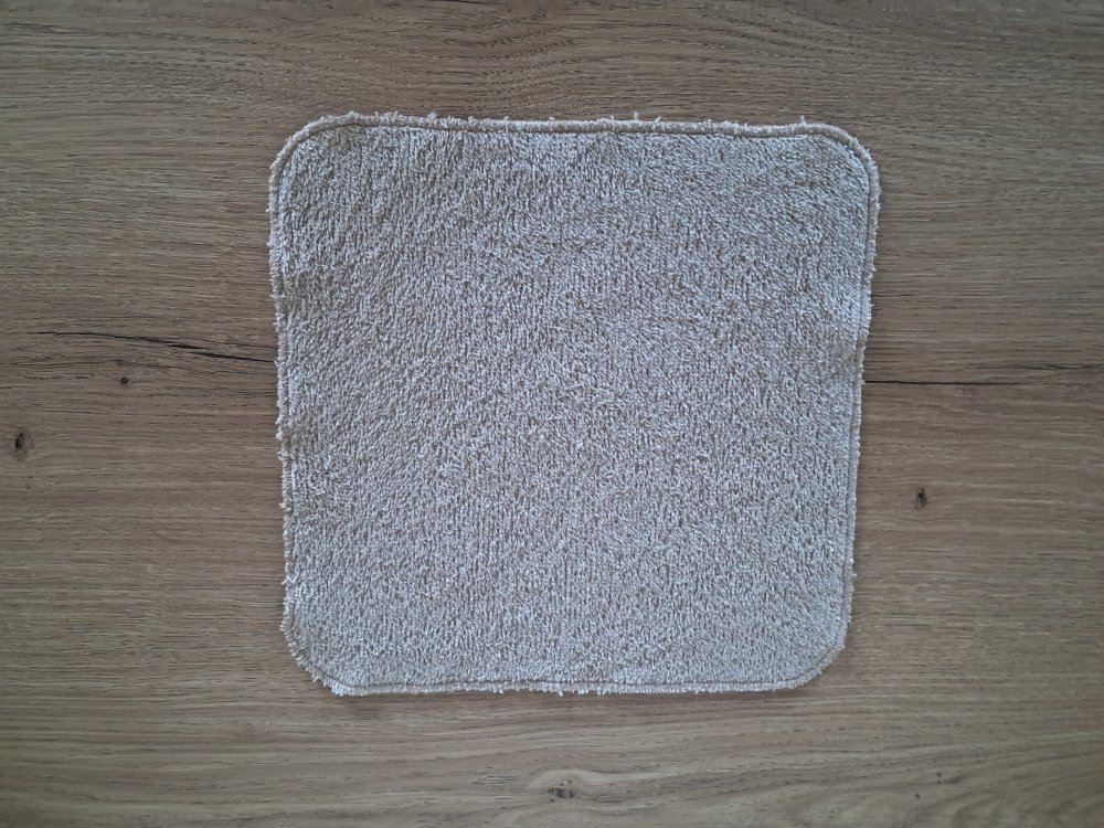 Carré de couleur "Beige Clair", aux bords arrondis qui mesure 25 cm environ, dont les bords ont été soigneusement fini à la surjeteuse et peuvent présenter un visuel imparfait, ceci étant volontaire de ma part.