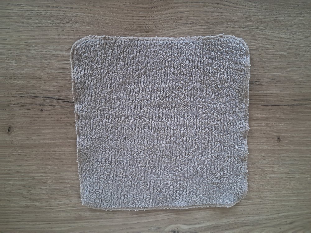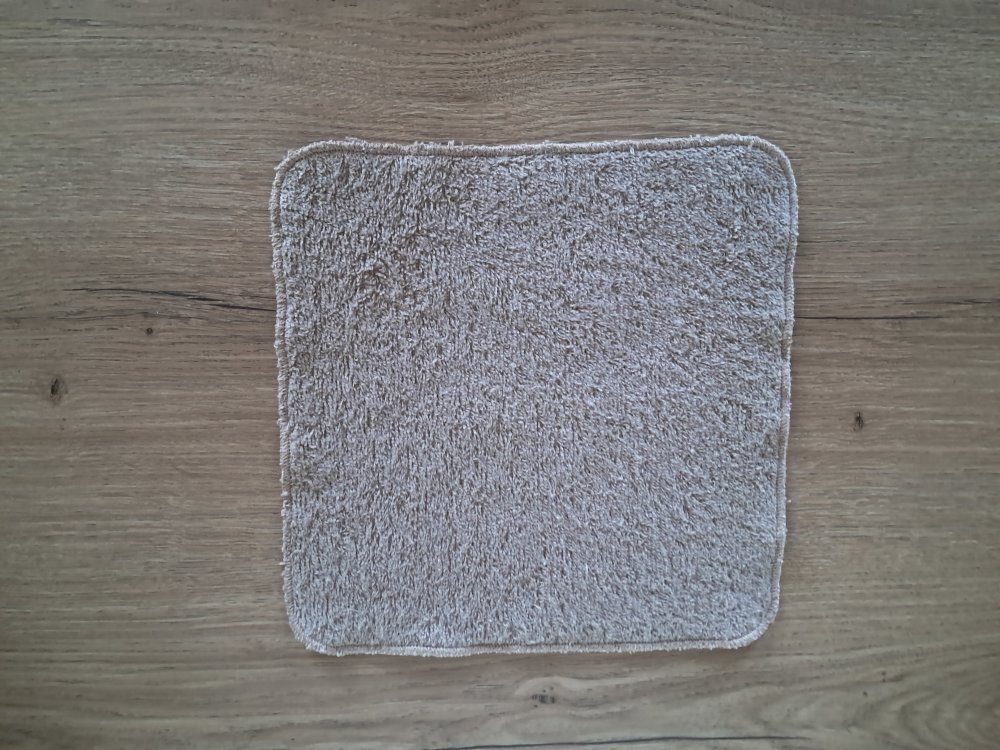 Carré de couleur "Beige Foncé", aux bords arrondis qui mesure 25 cm environ, dont les bords ont été soigneusement fini à la surjeteuse et peuvent présenter un visuel imparfait, ceci étant volontaire de ma part.