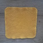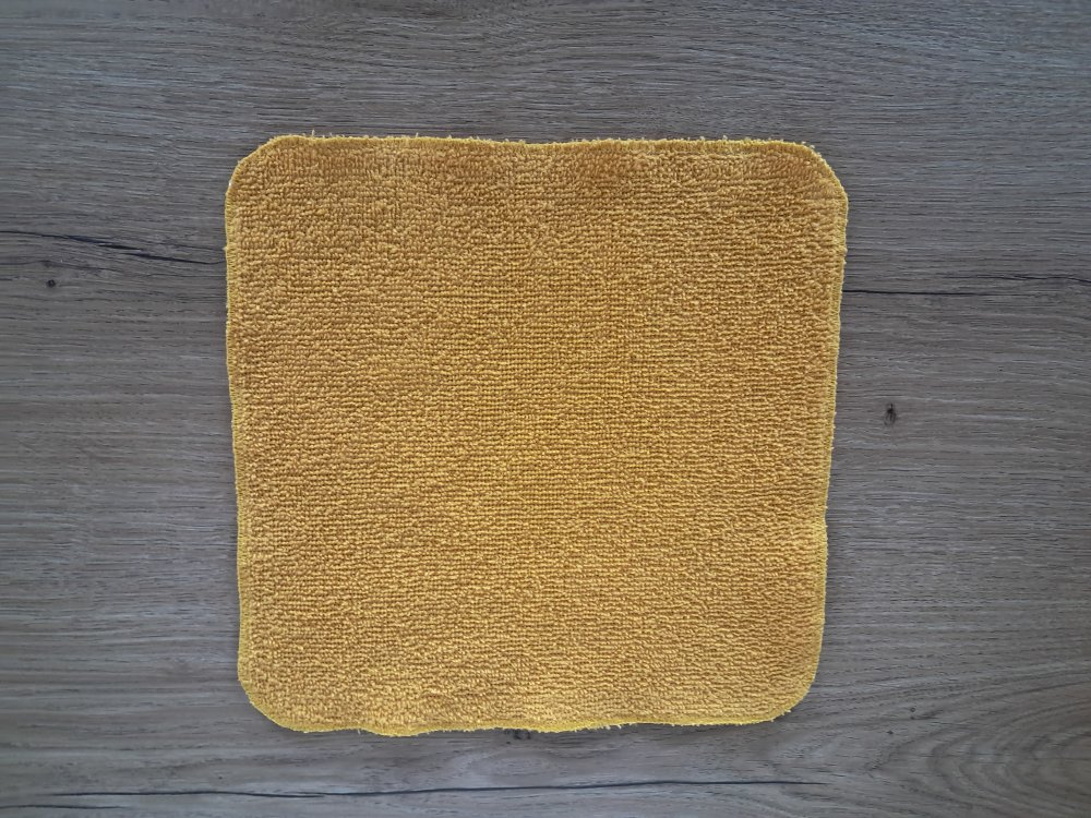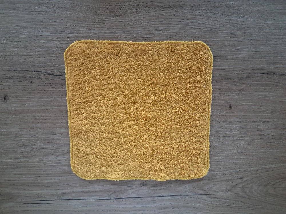 Carré de couleur "Curry", aux bords arrondis qui mesure 25 cm environ, dont les bords ont été soigneusement fini à la surjeteuse et peuvent présenter un visuel imparfait, ceci étant volontaire de ma part.