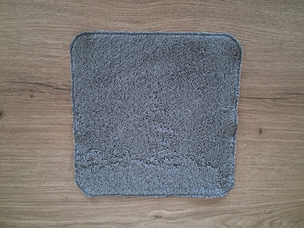 Carré de couleur "Gris Foncé", aux bords arrondis qui mesure 25 cm environ, dont les bords ont été soigneusement fini à la surjeteuse et peuvent présenter un visuel imparfait, ceci étant volontaire de ma part.