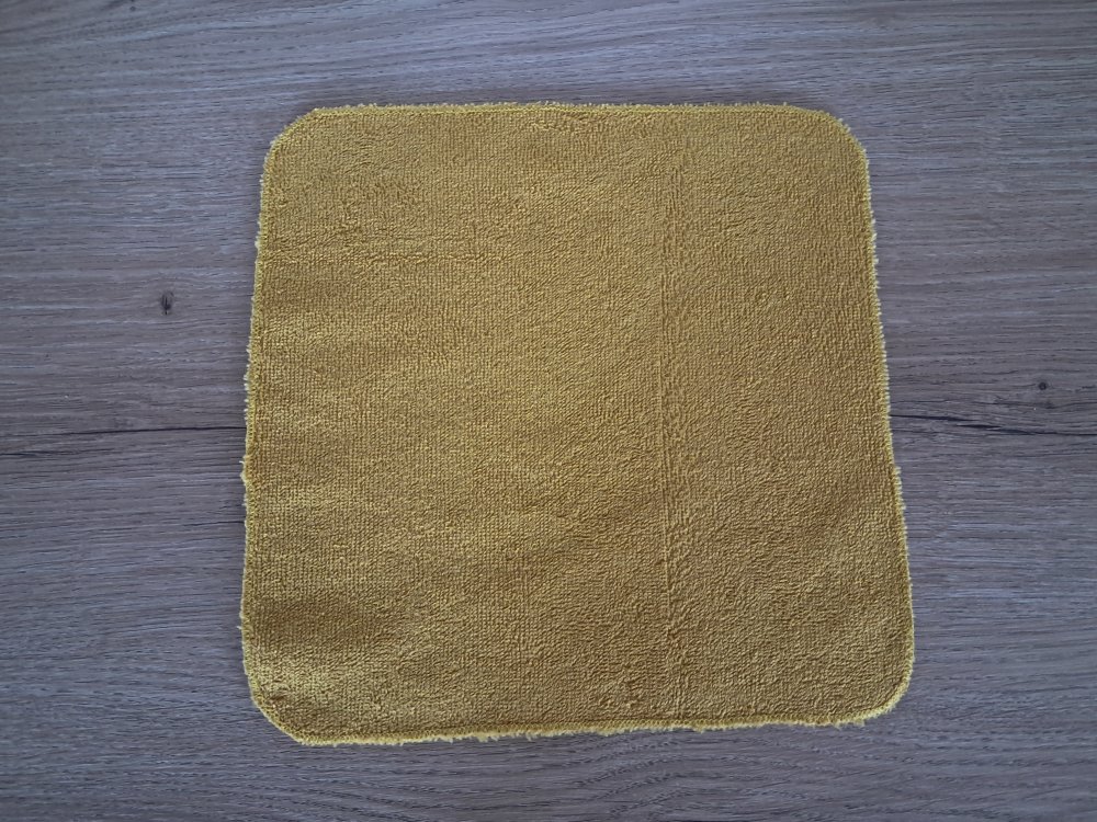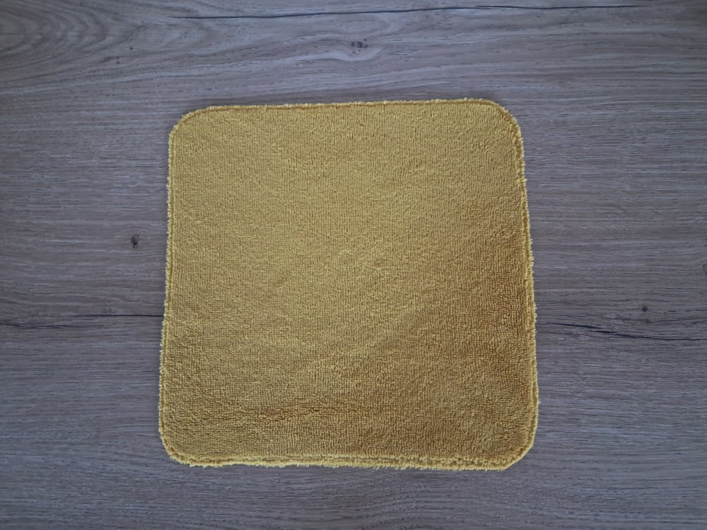 Carré de couleur "Curry", aux bords arrondis qui mesure 25 cm environ, dont les bords ont été soigneusement fini à la surjeteuse et peuvent présenter un visuel imparfait, ceci étant volontaire de ma part.