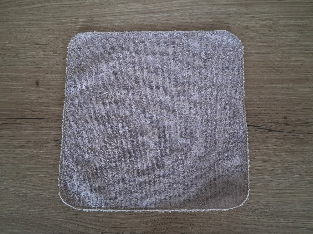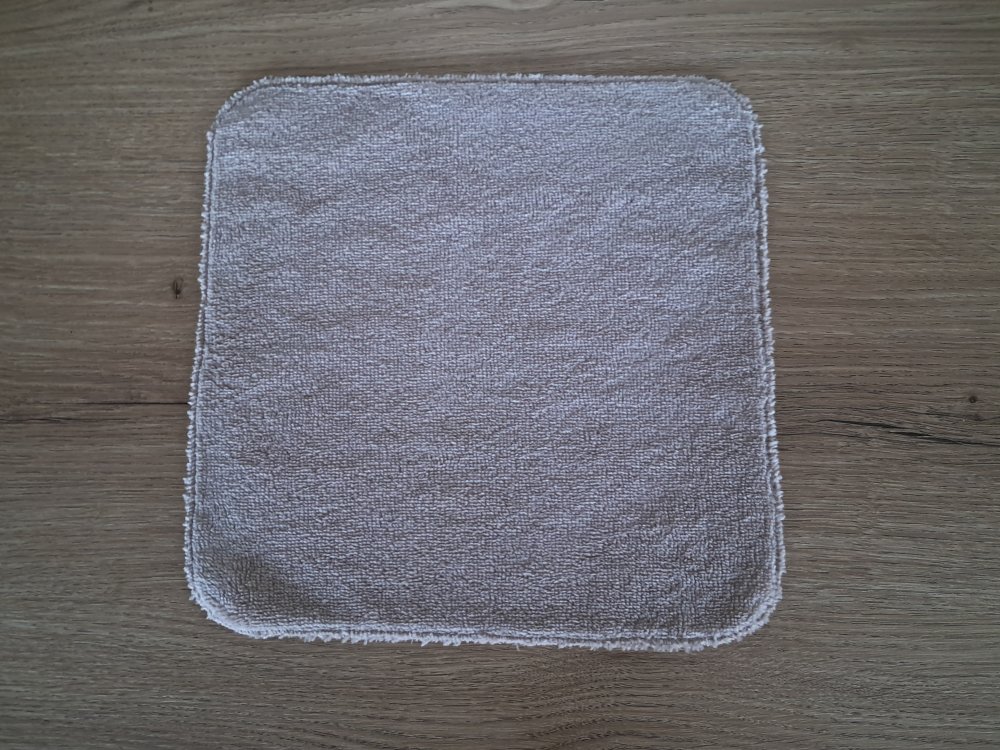 Carré de couleur "Gris Clair", aux bords arrondis qui mesure 25 cm environ, dont les bords ont été soigneusement fini à la surjeteuse et peuvent présenter un visuel imparfait, ceci étant volontaire de ma part.