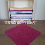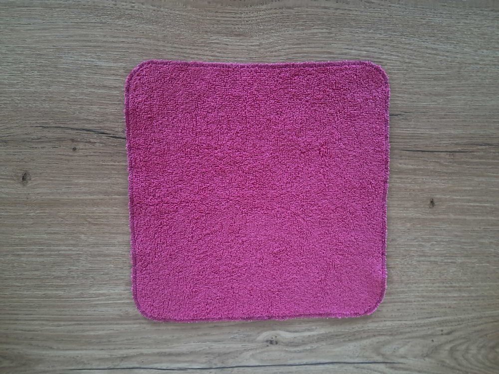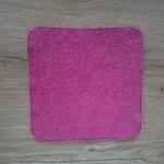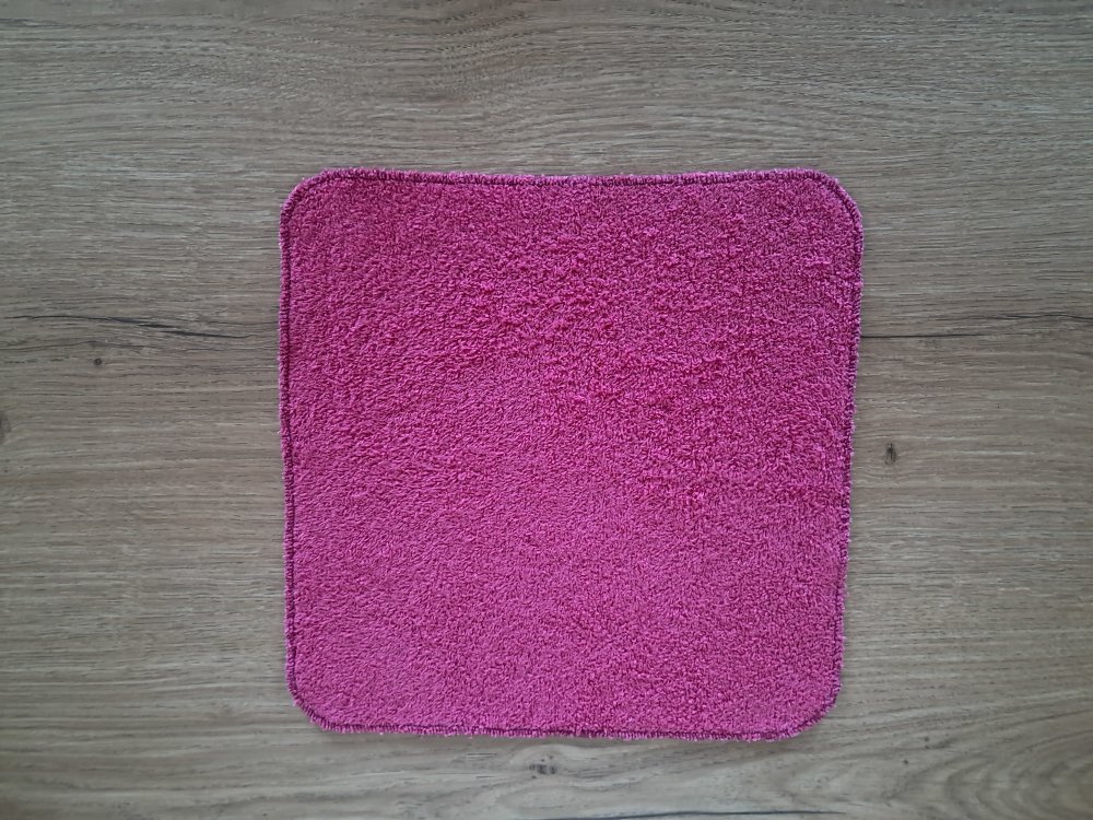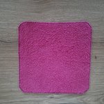 Carré de couleur "Fushia", aux bords arrondis qui mesure 25 cm environ, dont les bords ont été soigneusement fini à la surjeteuse et peuvent présenter un visuel imparfait, ceci étant volontaire de ma part.