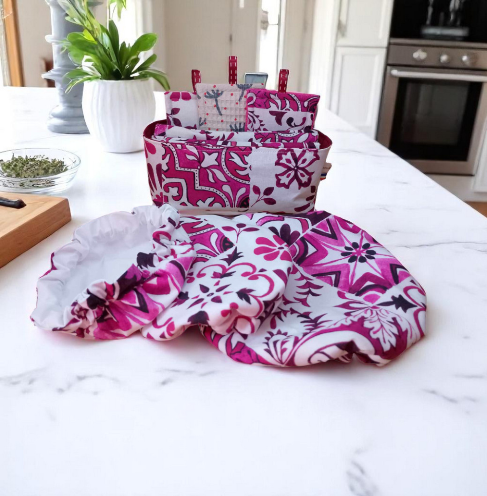 kit cuisine zéro déchet, panière, 6 essuie-tout, 3 charlottes et 3 éponges modèle carreaux faïence rose byzantin