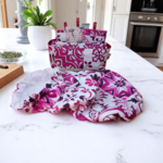 Je vous propose un ensemble zéro déchet pour la cuisine. Il est cousu dans une popelinde de coton de qualité certifié OEKO-TEX au motif carreaux de faïence rose byzantin. Les essuie-tout sont doublés d'éponge nid d'abeille motif pissenlit. Les charlottes sont doublées de PUL certifié contact alimentaire de coloris blanc. Les éponges sont doublées d'éponge, d'éponge nid d'abeille et de filet mesh aux coloris en adéquation avec le coton imprimé. La grande panière est doublée d'un coton vert.