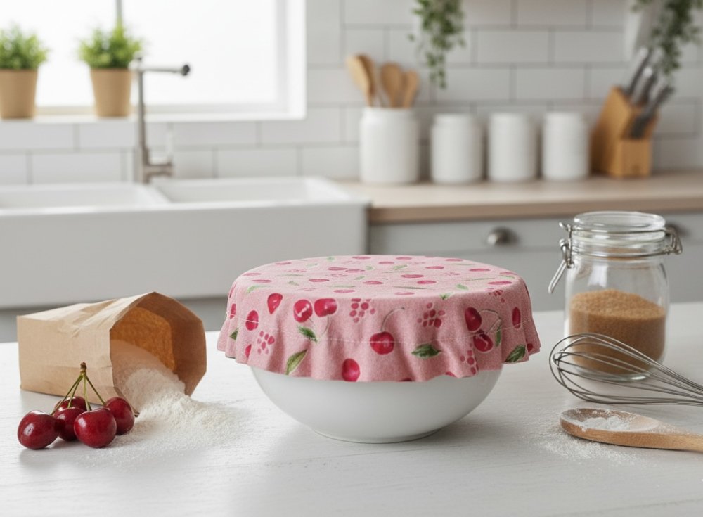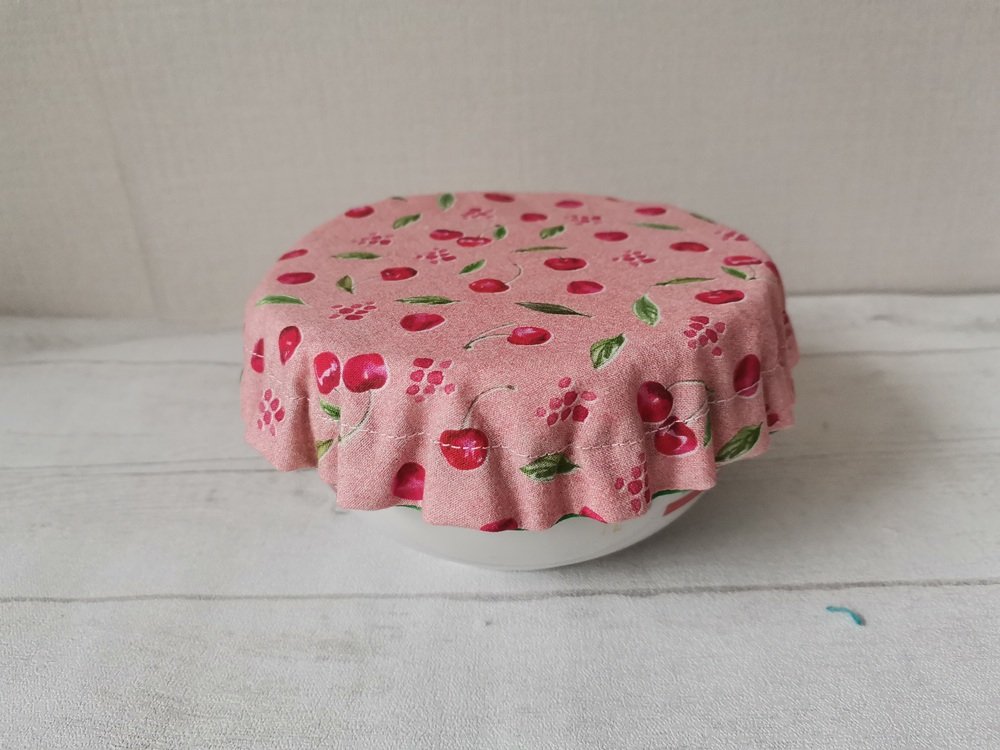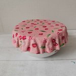 Charlotte alimentaire/couvre plat réalisé avec du tissu coton certifié Oeko-Tex motif cerises sur fond rose et doublé en tissu PUL, spécialement conçu pour un contact alimentaire sans transfert de substances nocives. Le PUL est également imperméable, préservant ainsi la fraîcheur de vos préparations.