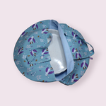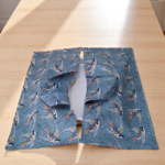 Il est réalisé dans un coton imprimé, doublé d’un coton uni, certifiés OEKOTEX, son diamètre est de 40 cm et les poignées de transport mesurent 37 cm.