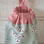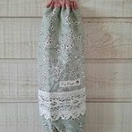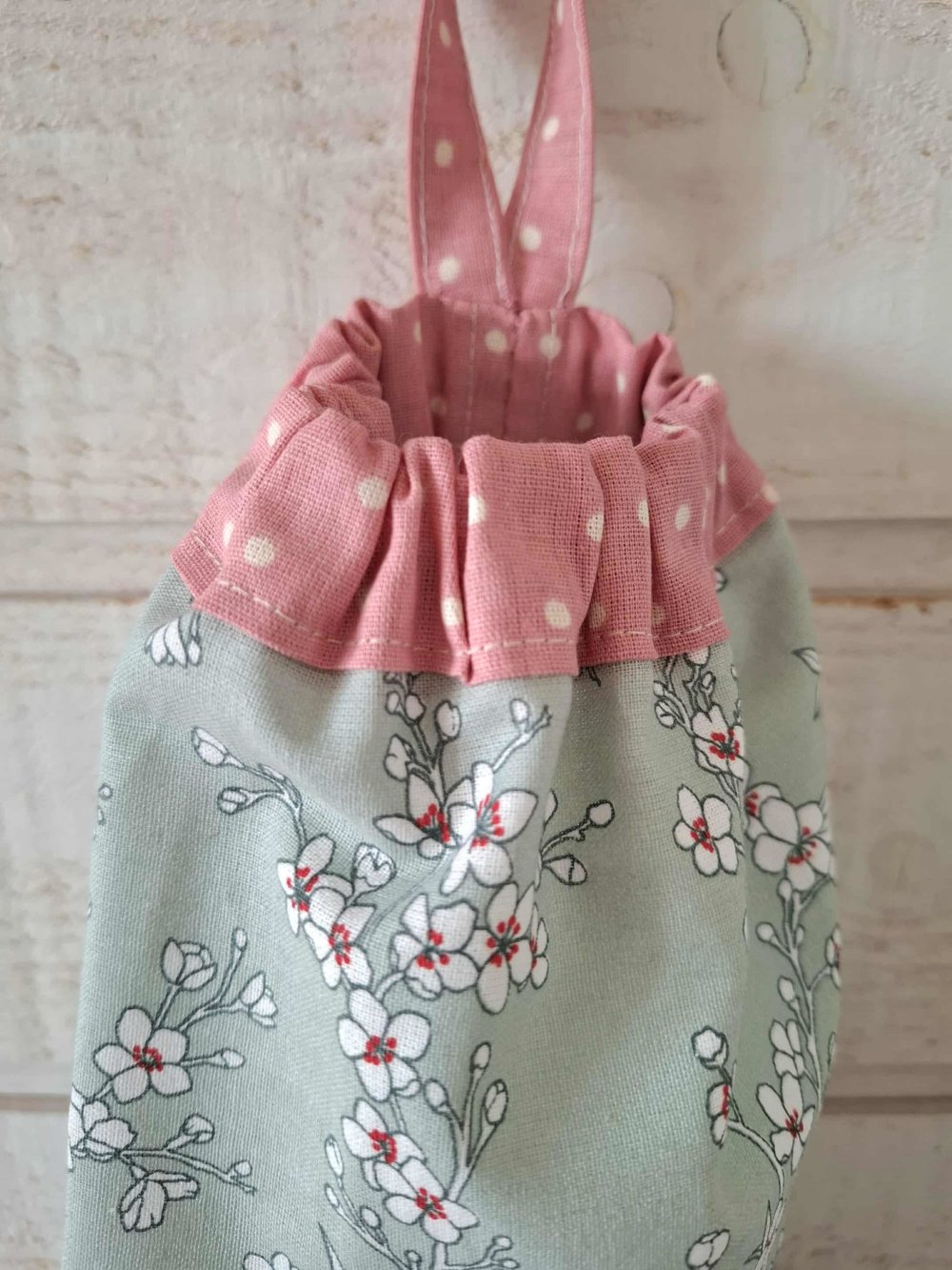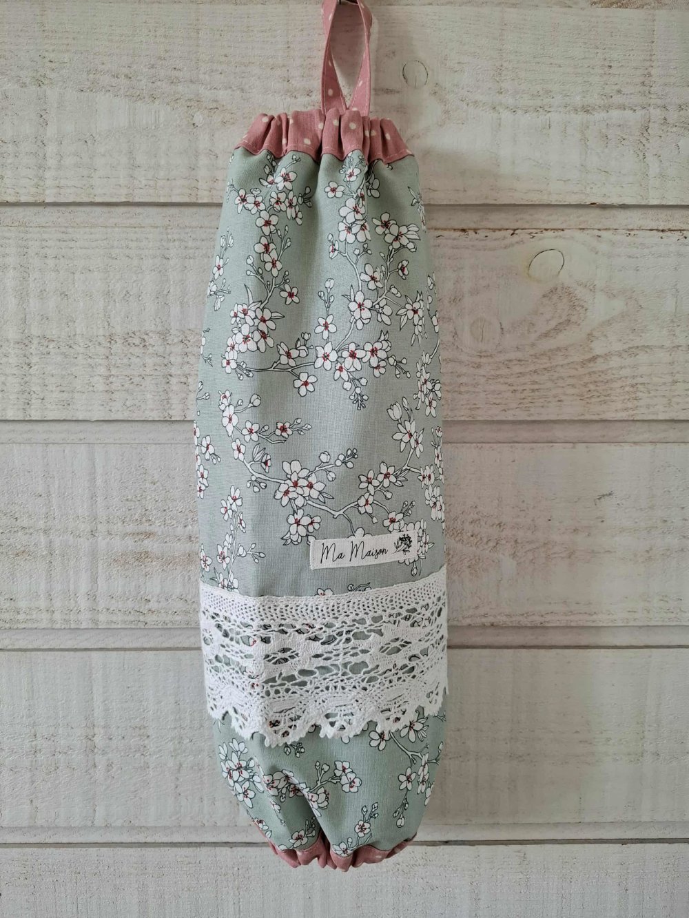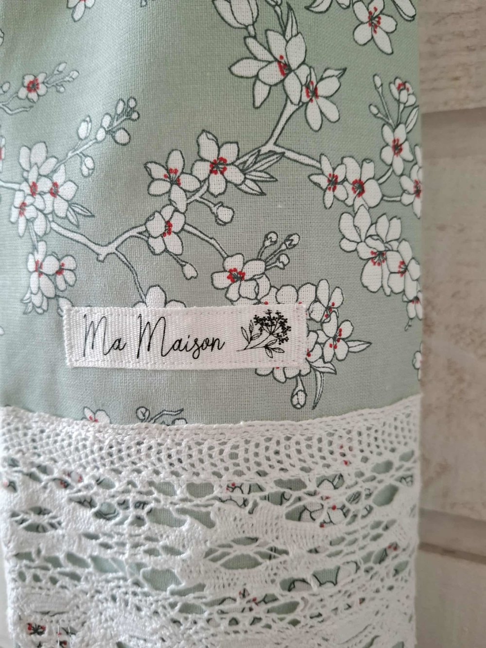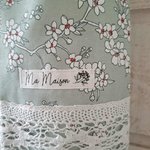 - Tissu coton vert d'eau fleuri et rose, dentelle blanche, ruban imprimé "Ma Maison"