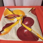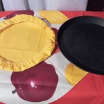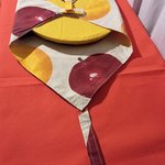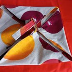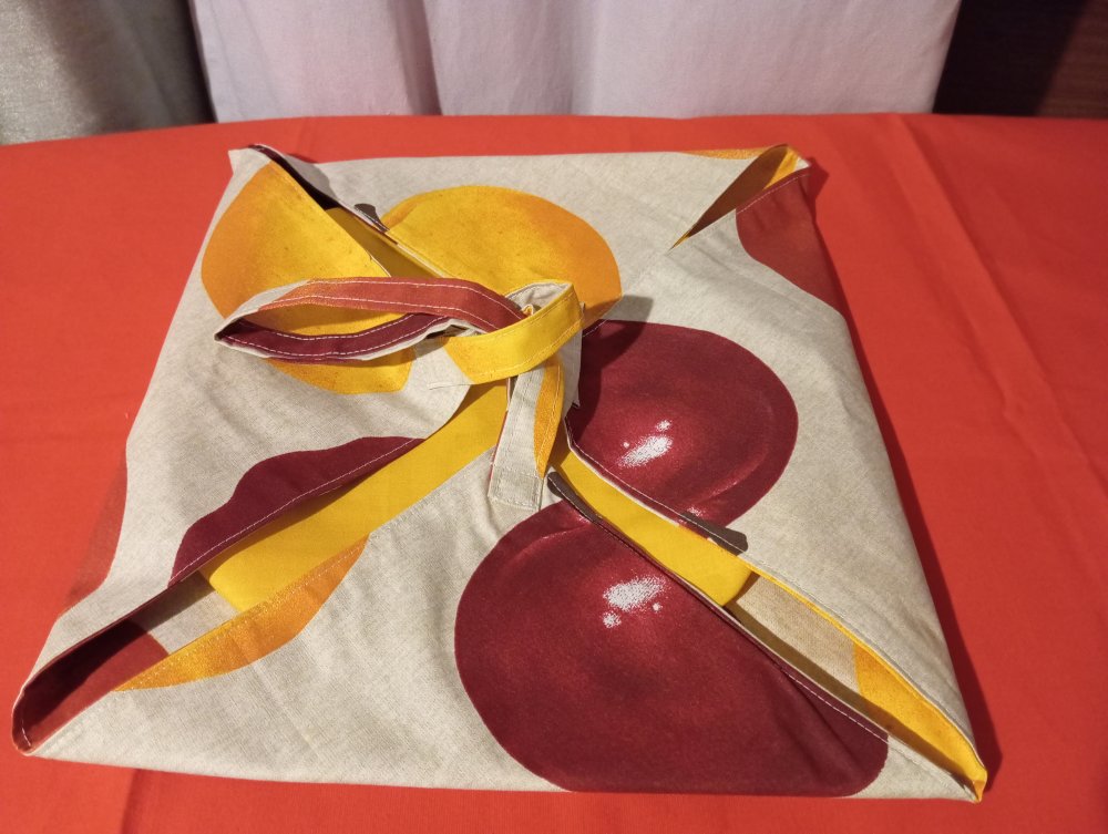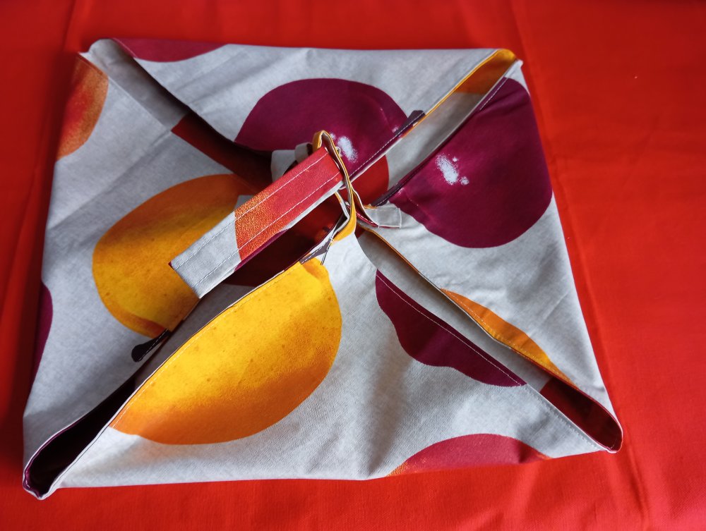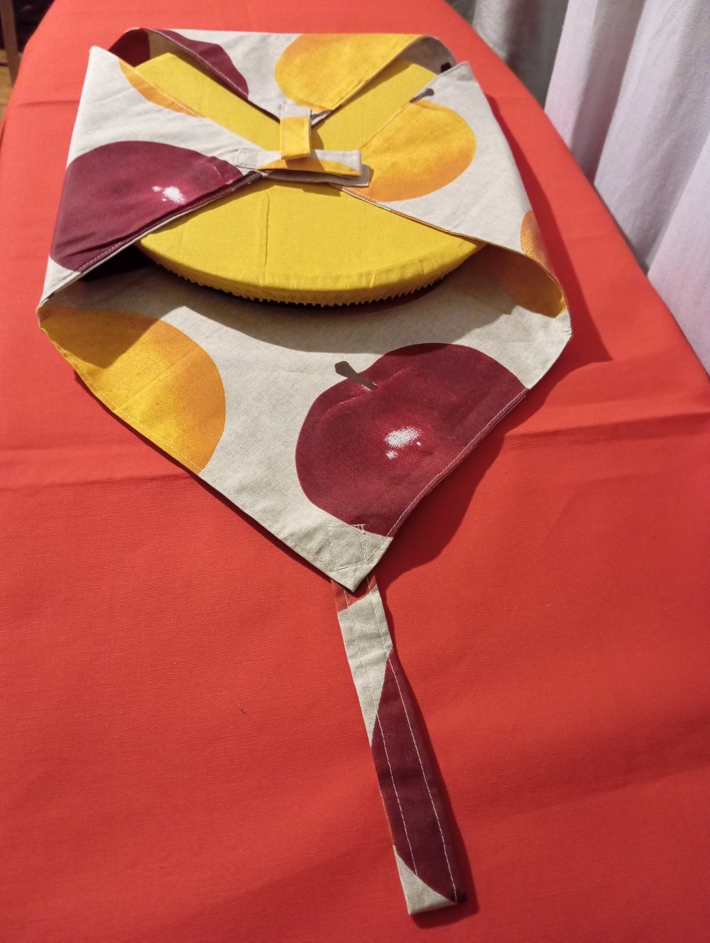 Pour transport, vous posez votre tarte au milieu du tissu doublé sur la face carreaux ( l'autre est possible) . Vous passez la boucle la plus longue dans les trois autres et vous tirez en remontant. La grande boucle sert donc de poignée transport!