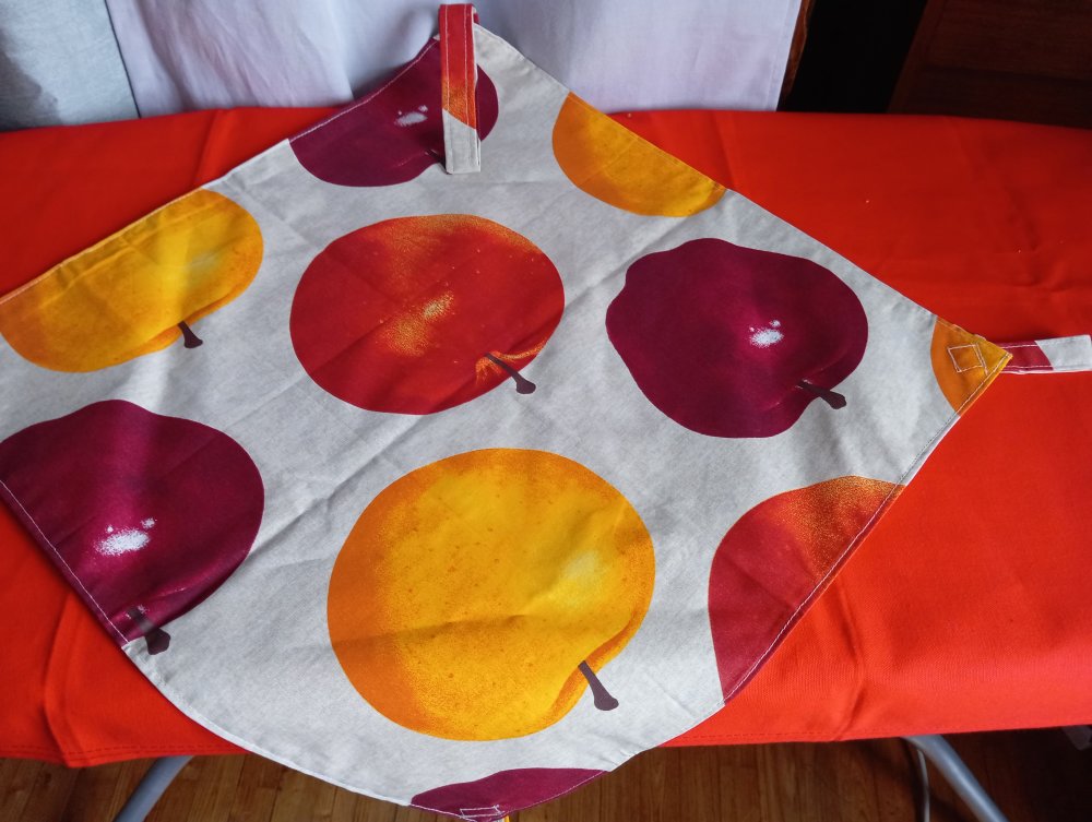 Forme carré (47 cm x 47 cm ) Doublé même tissu coton beige à motifs pommes.Le sac est cousu sur trois face, retourné , surpiqué , comme cela il sera solide et résistera à de nombreux lavages sans se déformer. 4 boucles de coton cousues en double aux quatre coins , dont une plus longue qui sert de poignée.