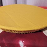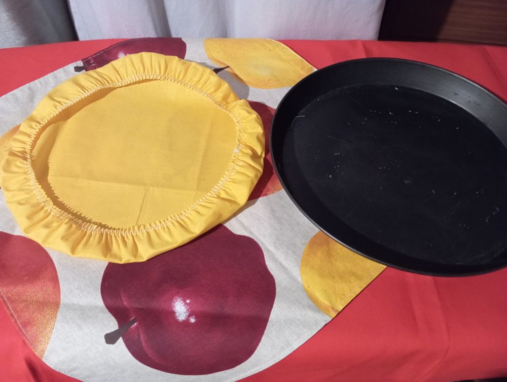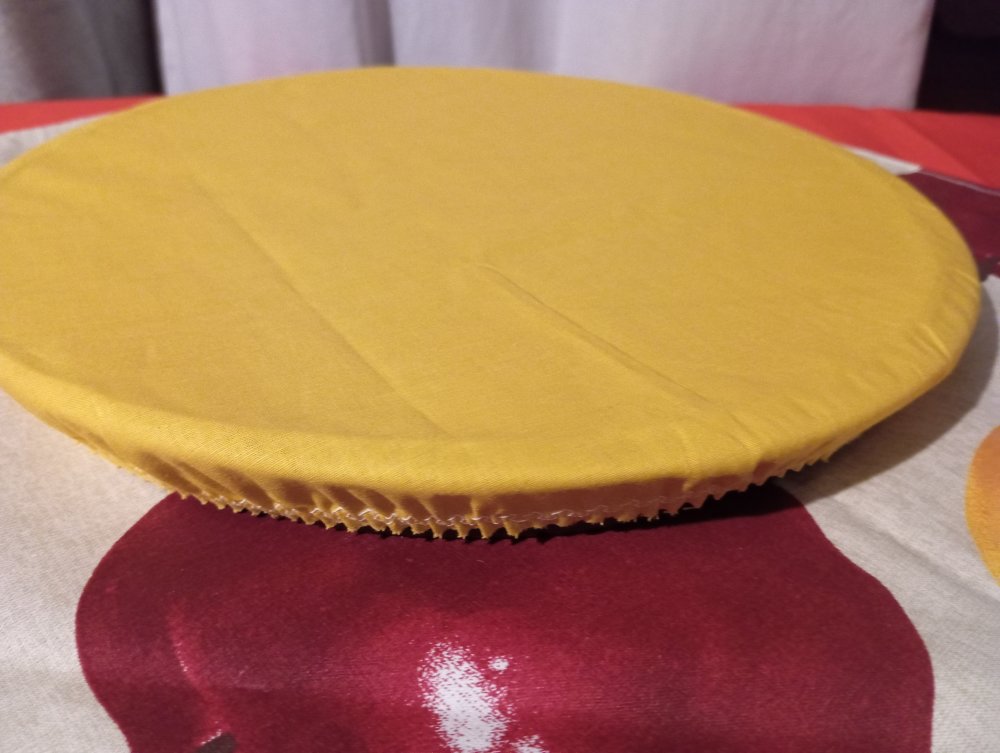 La charlotte est en coton jaune uni , elle est coupée et élastiquée pour un moule diamètre 32 cm .