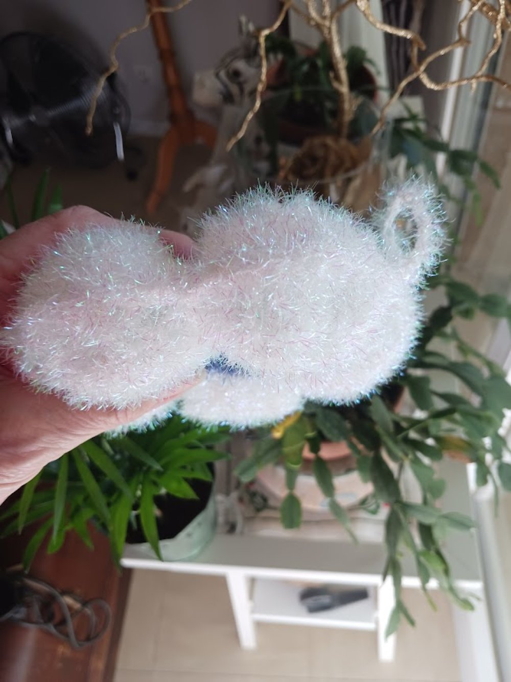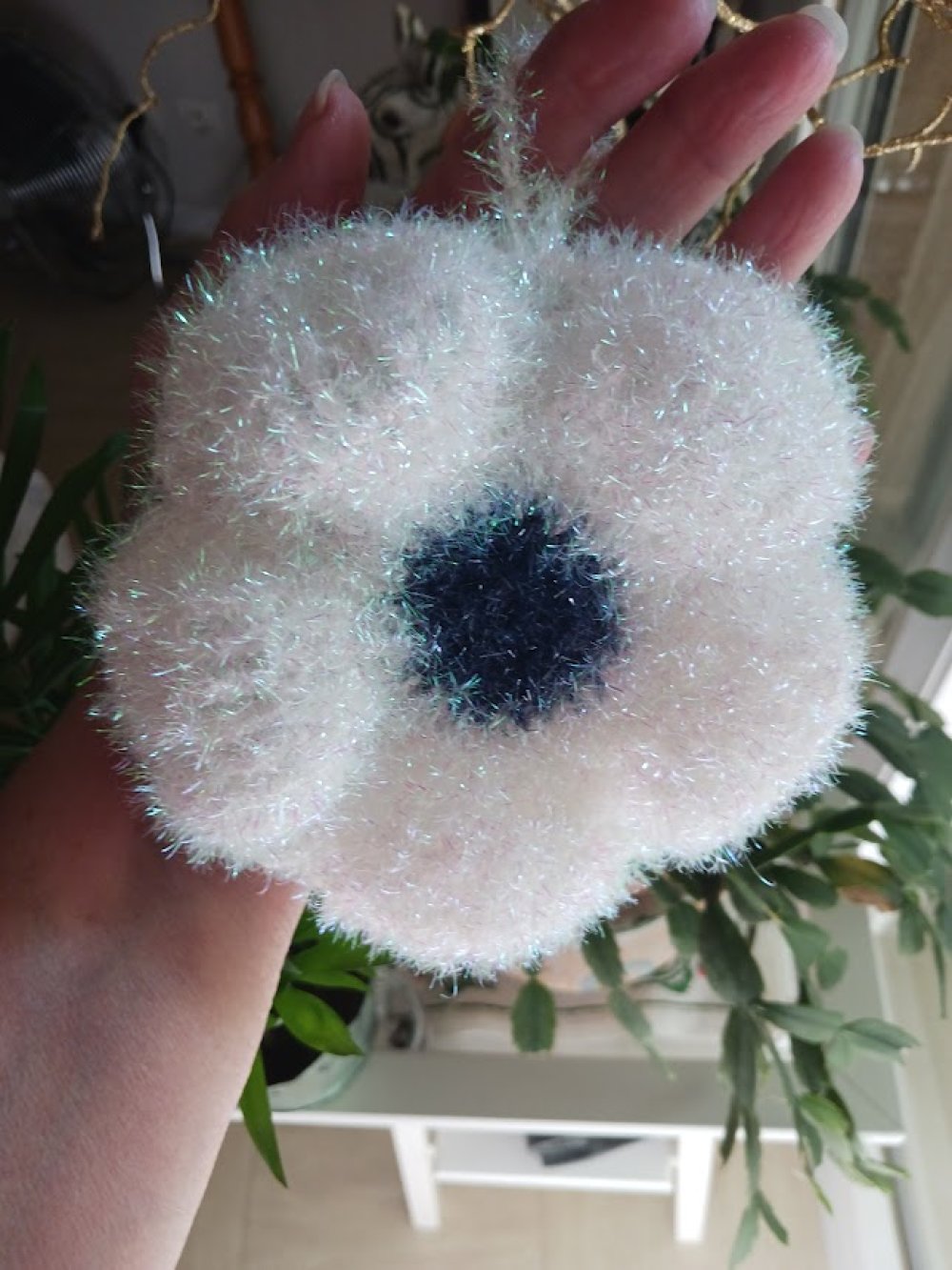 Tawashi fleur de douche ou de vaisselle lavable et durable "blanc scintillant/marine "au crochet Fait Main
