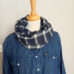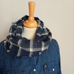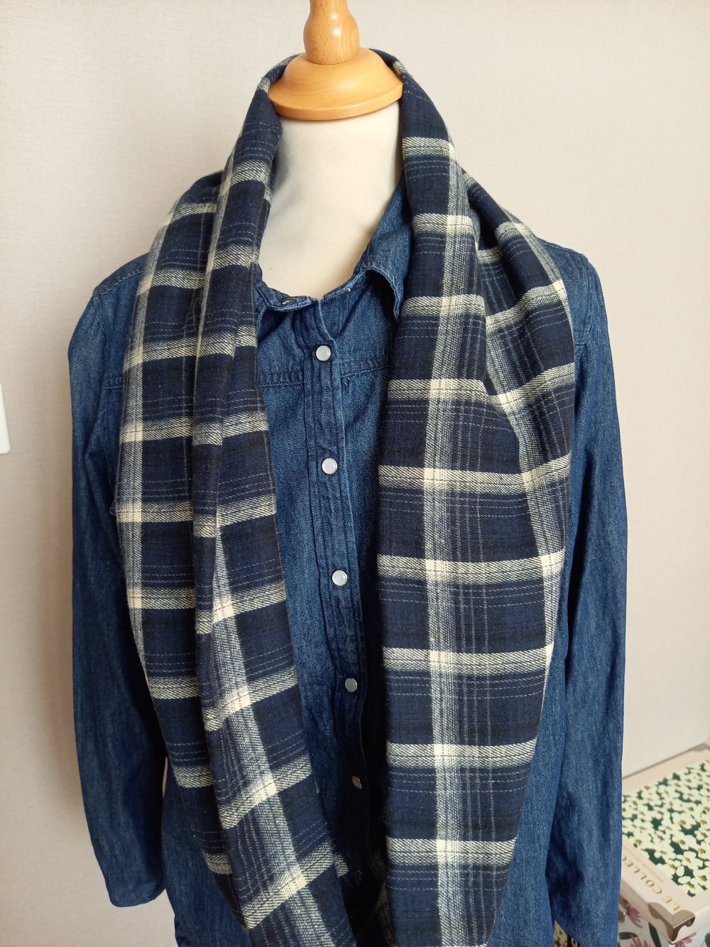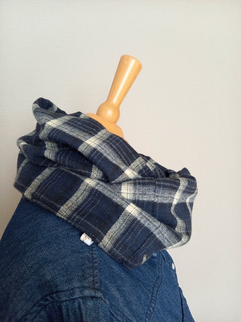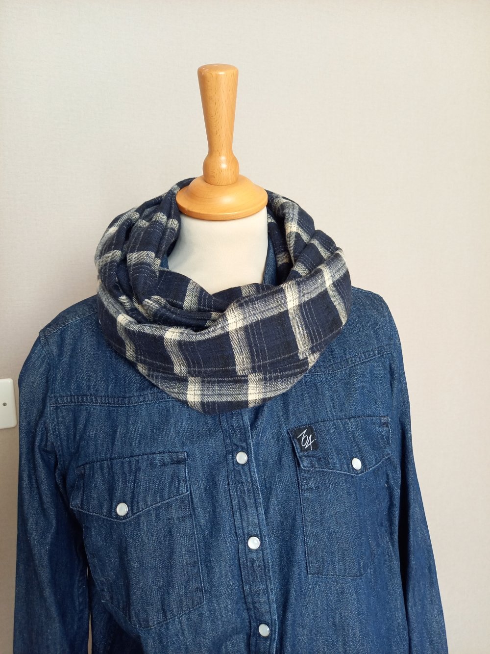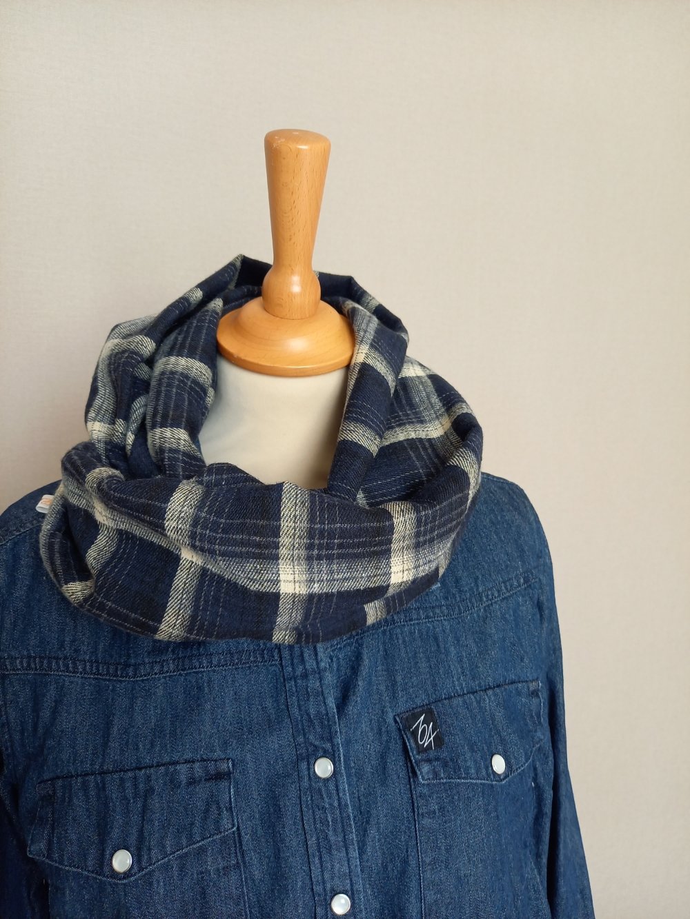 Snood pour homme ou mixte, réalisé dans un tissu écossais en flanelle, 65% polyester et 35% coton, tout doux, bien chaud et souple, de couleur marine et écru , faire 2 tours autour du cou.